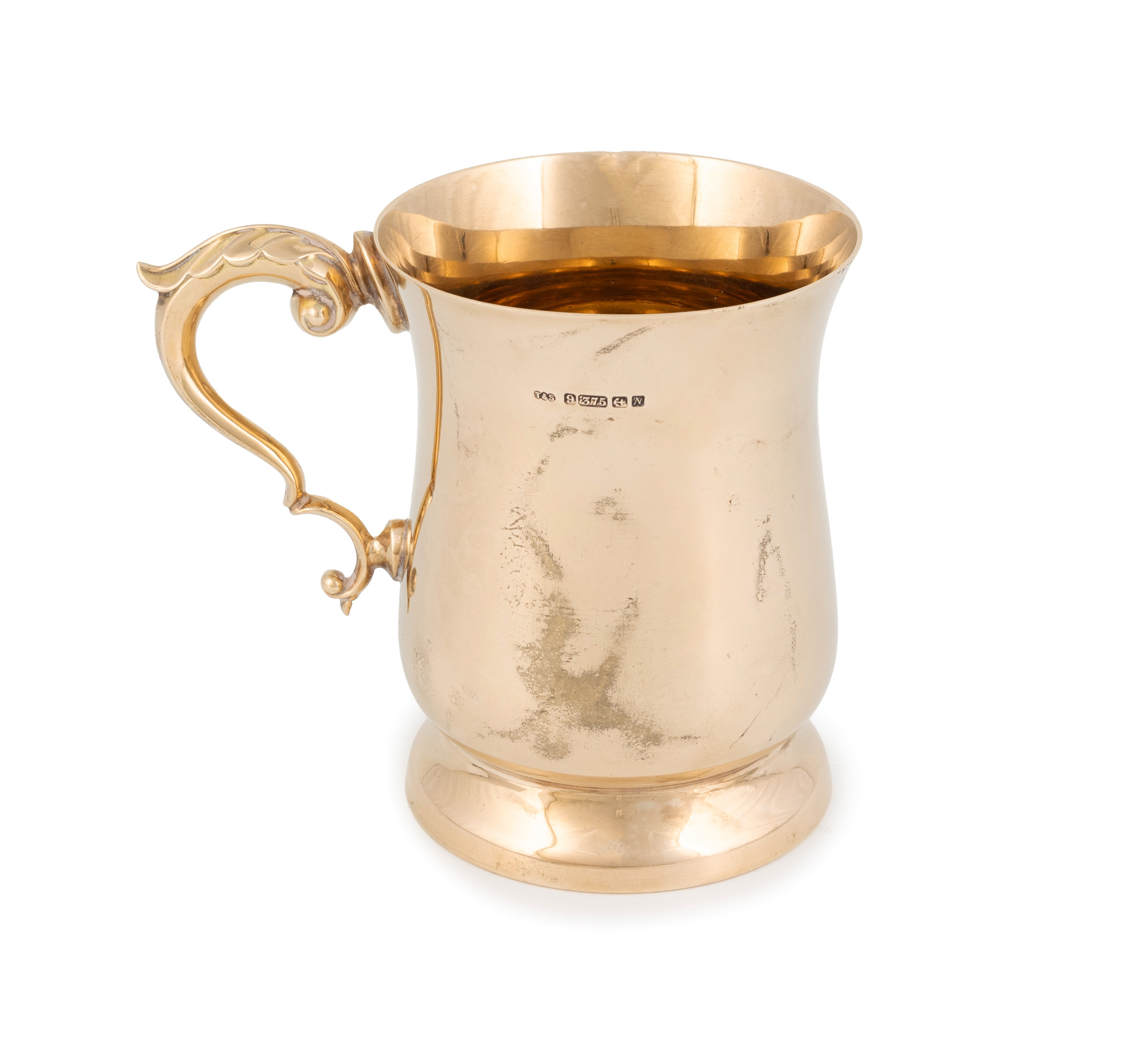 baluster form, leaf-capped scroll handle, on a circular foot, height 10.5cm, approx. weight 7.7 troy oz., (242.1g).