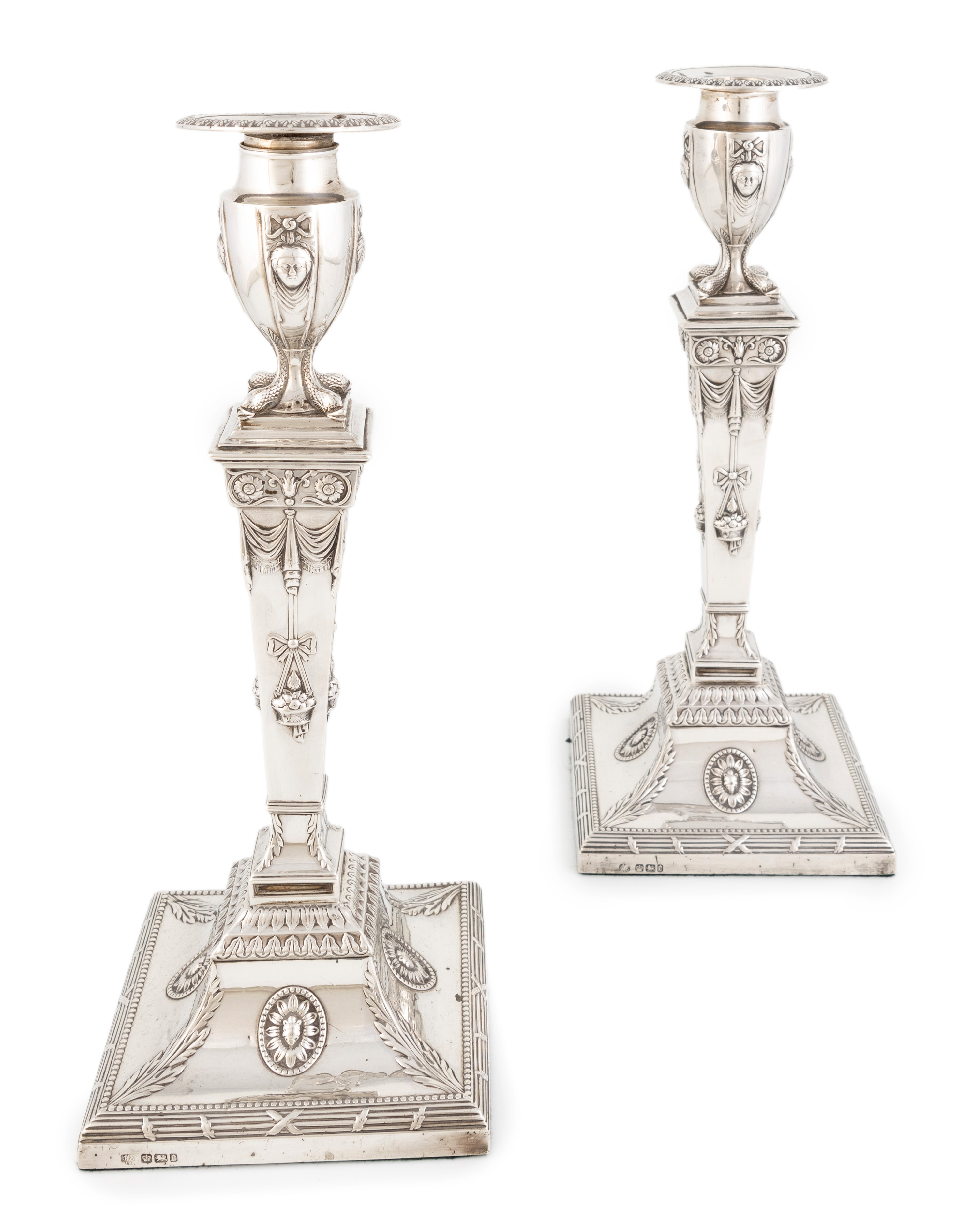 tapering square columns, with classical ribbon, drapery and fruit, urn-shaped capitals, beaded borders, on raised loaded square bases with medallion and foliate decoration, height 32cm. (2)