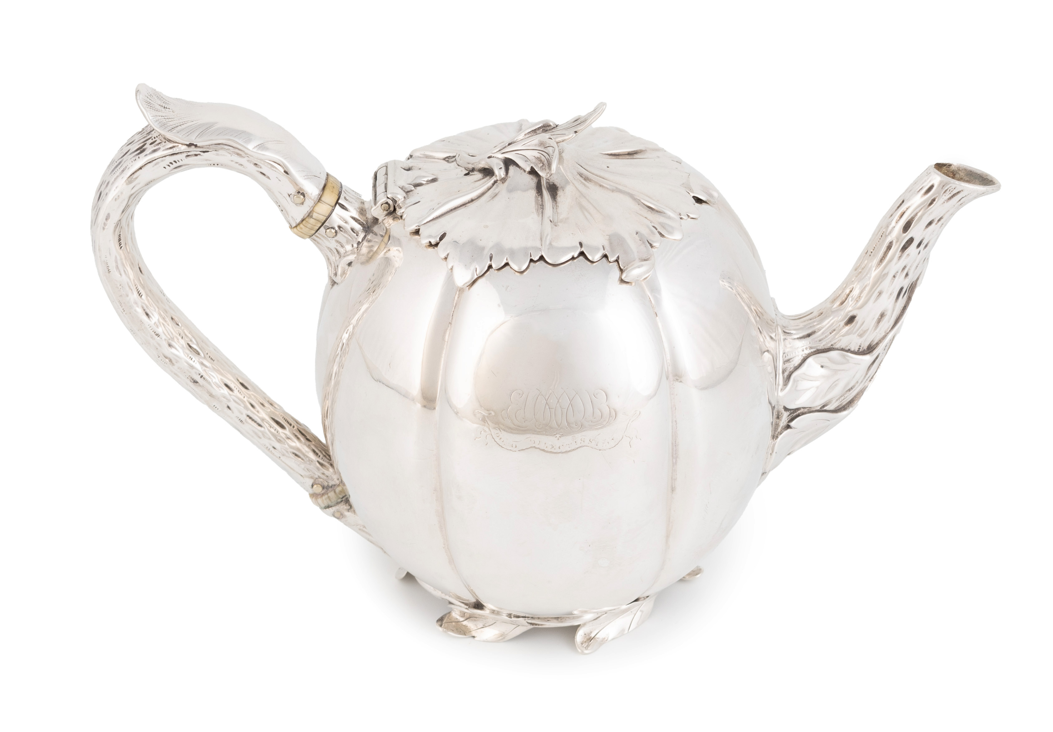 melon form, leaf-capped scroll handle with ivory insulators, engraved with initials, shaped foliate hinged cover with a leaf finial, the spout of simulated bark form with leaf mounts, on a circular leaf foot, length handle to spout 22.7cm, approx. weight 17.8oz.