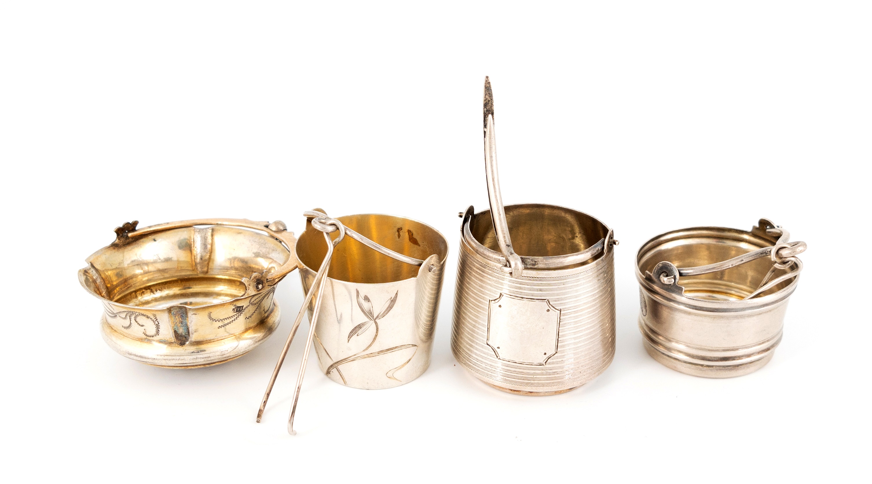 including: one of bucket form, reeded decoration, with a vacant cartouche, another of bucket form with engraved foliate decoration, a silver-gilt one and another,1892, approx. weight 3.2oz. (4)