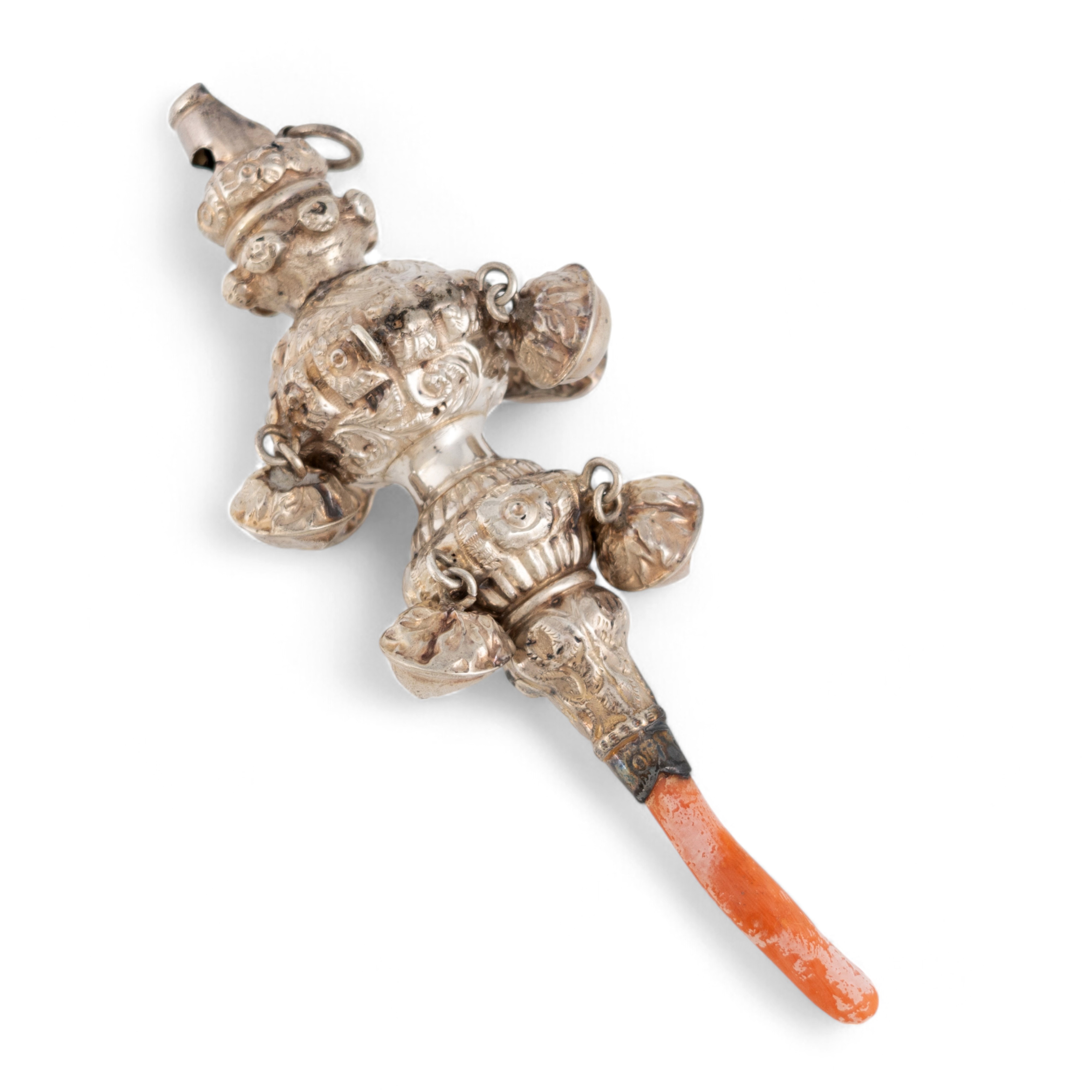 baluster and tapering circular form, embossed foliate decoration, tapering coral teether, with seven hanging bells and a hinged ring attachment, length 14cm, approx. weight 1.8oz.