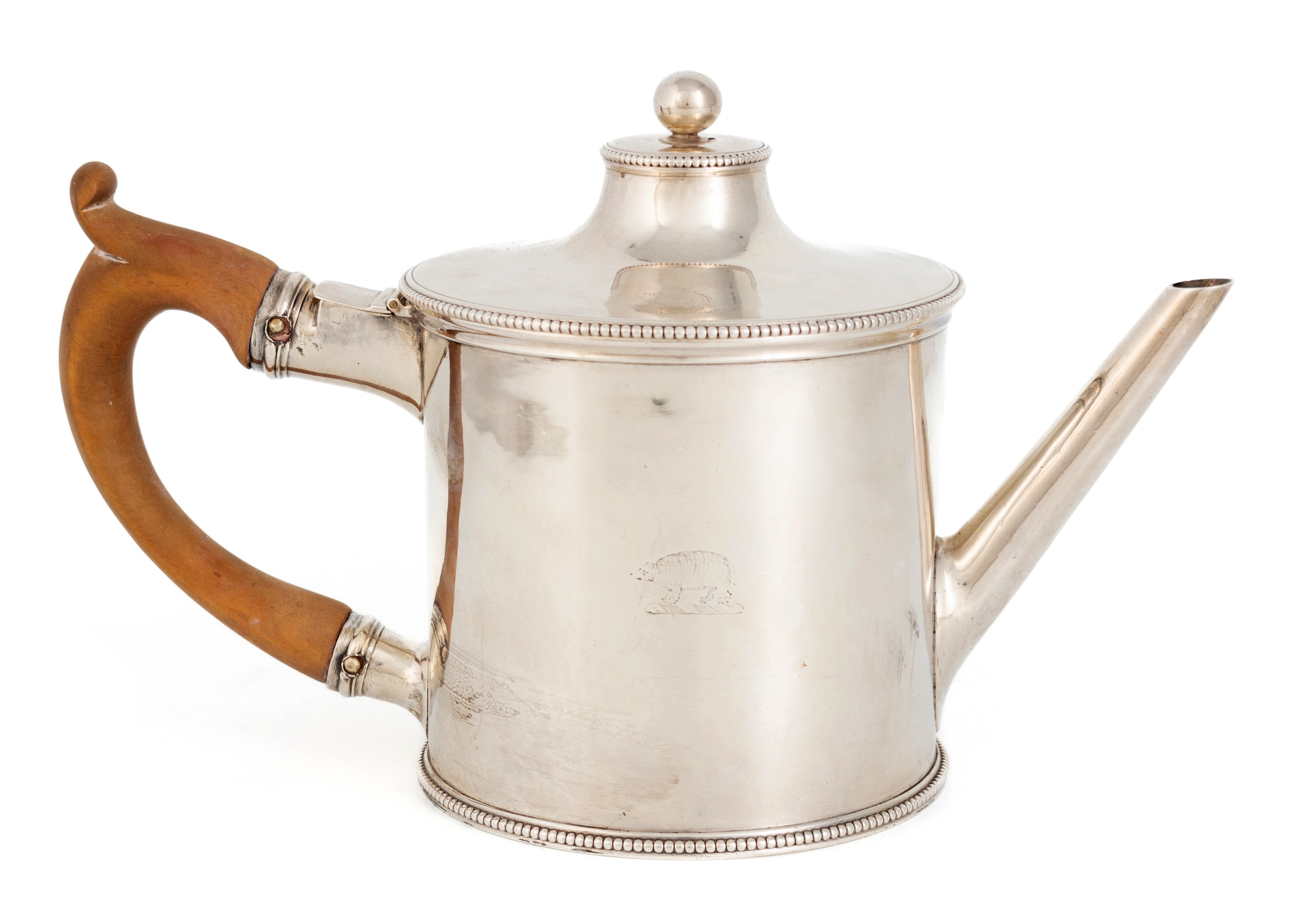 circular form, scroll handle, with a water compartment with a hinged cover, beaded borders, the pull-off cover with a ball finial, engraved with a crest, height 12.5cm, approx. weight 14.8oz.
