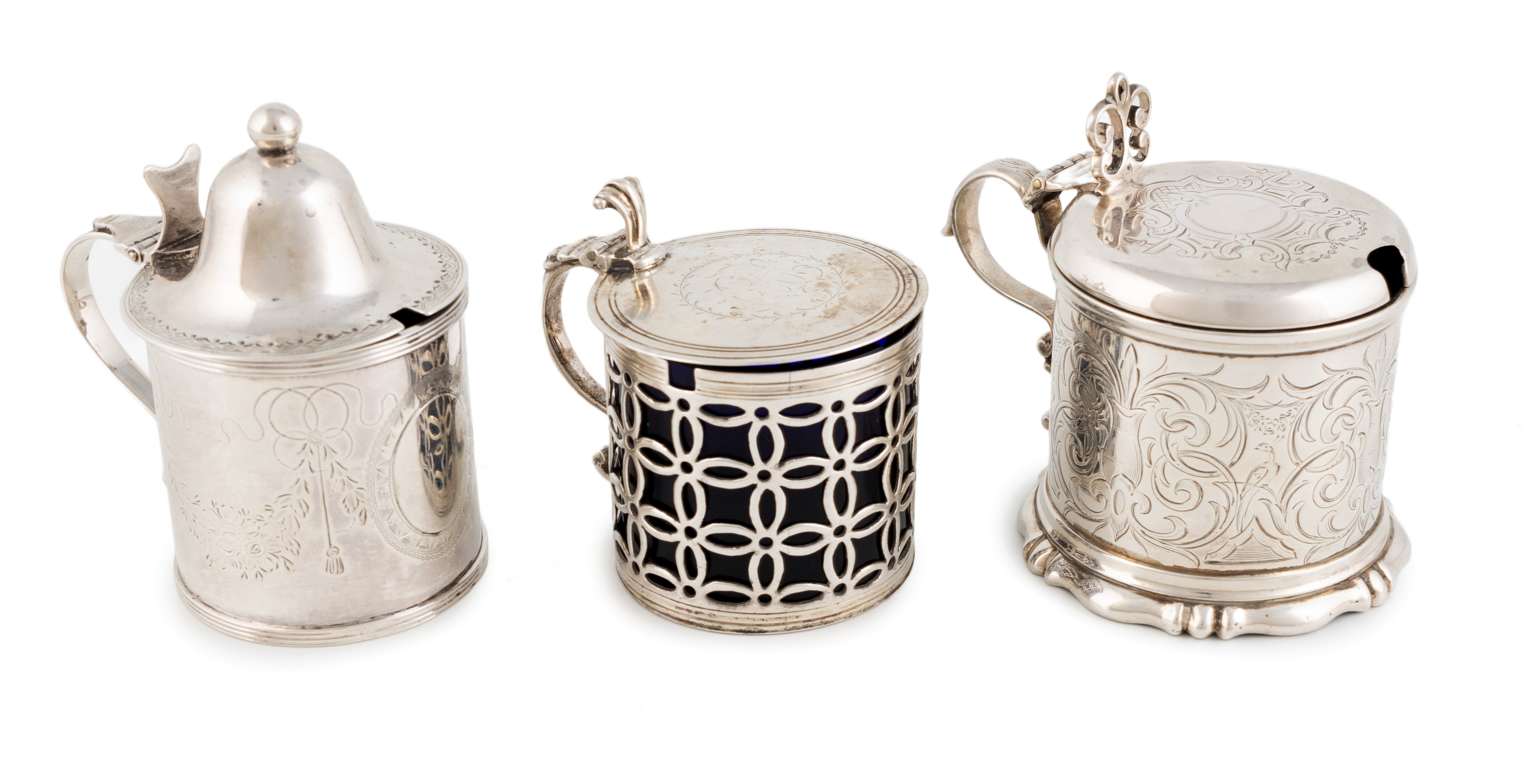 comprising: a George III one possibly by Sarah Buttall, London 1770, circular form with pierced decoration, worn engraved initials to the cover, with a blue glass liner, plus a provincial George III one by Robert Pinkey, Newcastle circa 1795, circular form with engraved floral garlands and a domed cover, with a blue glass liner, and a Victorian one by Fox & Fox, London 1850, circular form with engraved scroll foliate decoration, on a moulded base, with a blue glass liner, approx. total weight 9.9oz. (3)