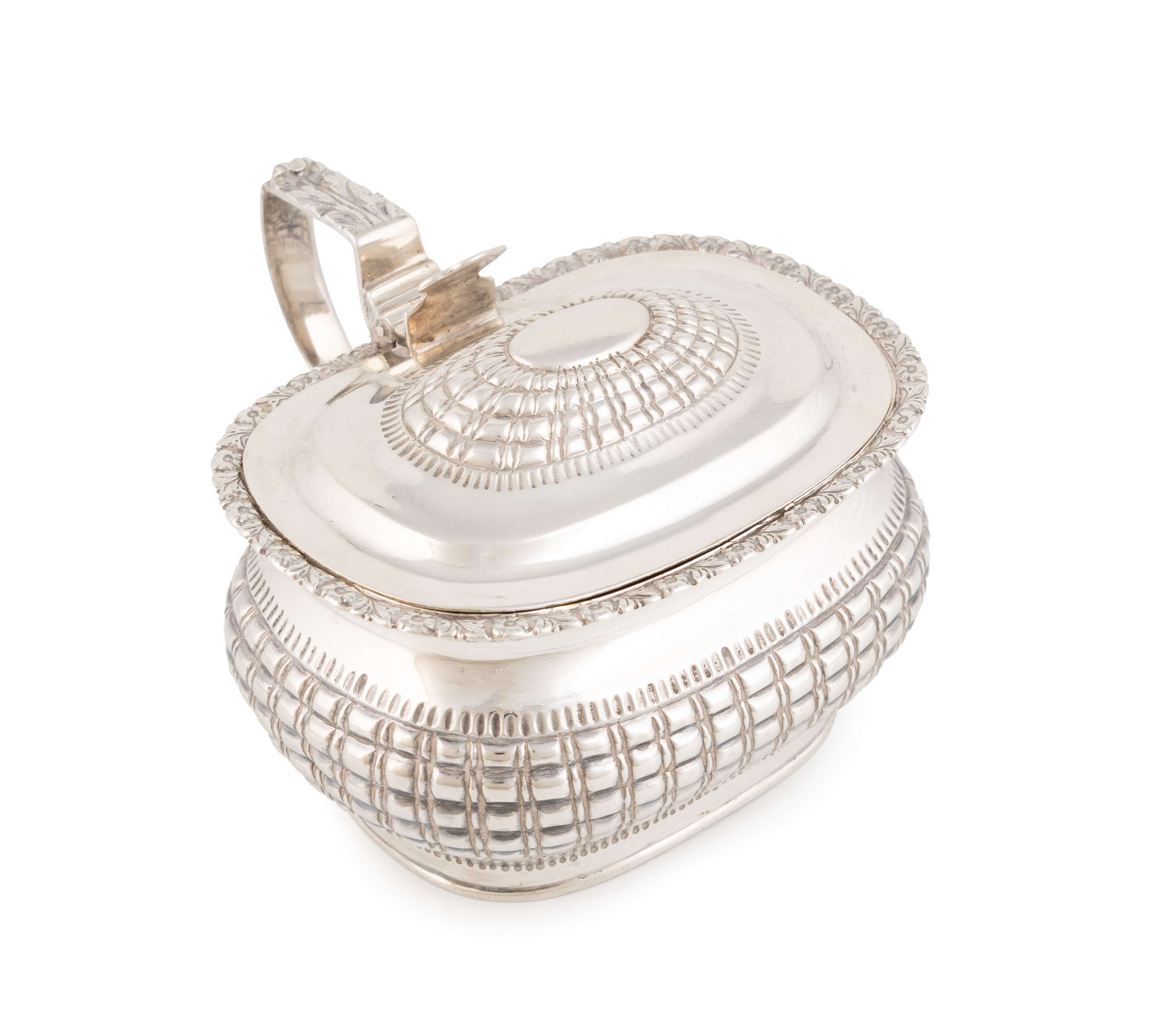 bellied rounded rectangular form with foliate border, embossed bee comb decoration, gilded interior, length 9.6cm, approx. weight 6.3oz.