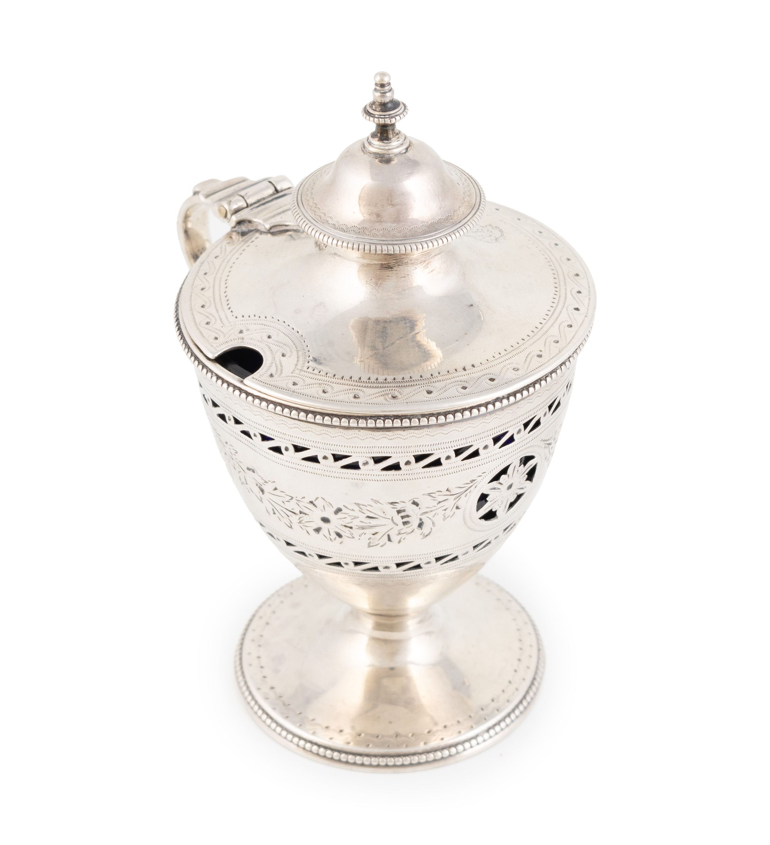 urn form with beaded borders, pierced and engraved with foliate decoration, raised cover with a knop finial, engraved crest to the cover, on a raised circular foot, with a blue glass liner, height 11.6cm, approx. weight 4.2oz.
