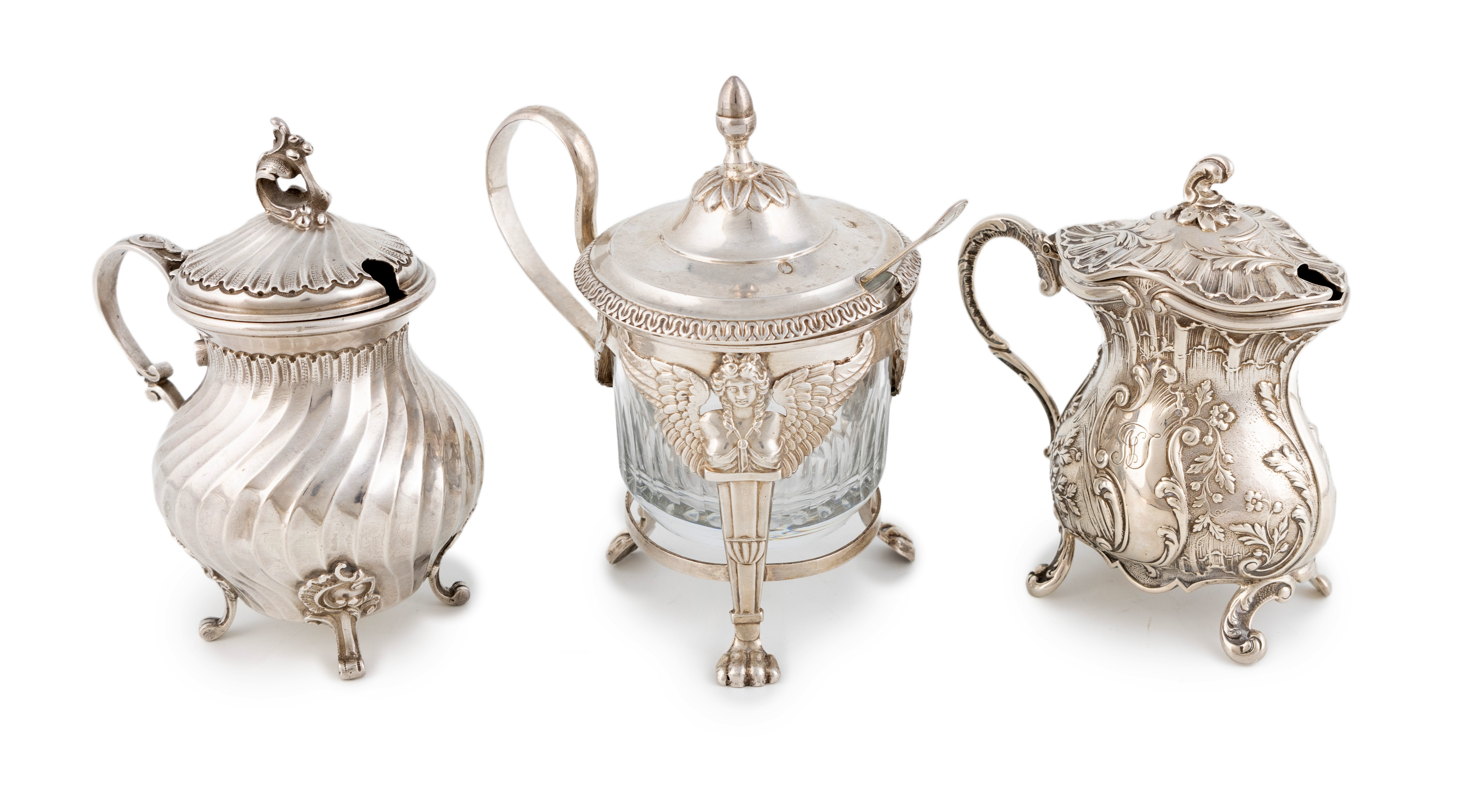 comprising: an early-19th century French one by Jean Pierre Nicolas Bibron, Paris circa 1800, circular form decorated with winged female figures, on three claw feet, clear glass liner, with an associated spoon, plus a Dutch one with importer's marks of Elkington & Co Ltd, London 1896, baluster form with embossed scroll foliate decoration, and one with the maker's mark EC, London 2008, baluster form with spiral fluted decoration, on three scroll feet, approx. total weight 8.5oz. (4)