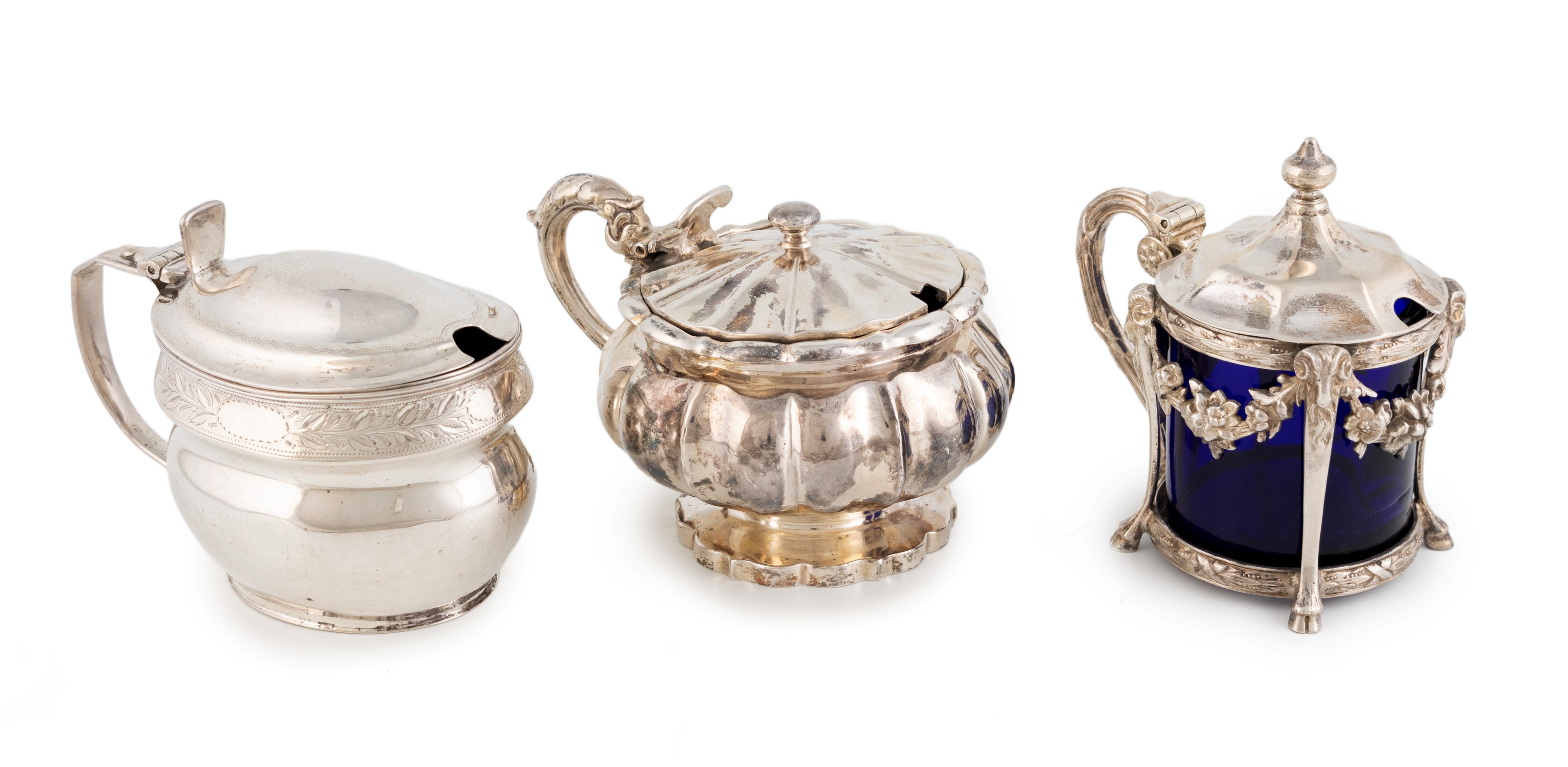 comprising: one by Deakin & Francis, Birmingham 1933, circular lobed form, with blue glass liner, plus an Edwardian one by Roberts & Belk Ltd, Sheffield 1906, circular form with foliate garlands and ram mask capped hoof feet, and one by Richard Comyns, London 1937, plain oval form with an engraved foliate top band of decoration, approx. total weight 12.8oz. (3)