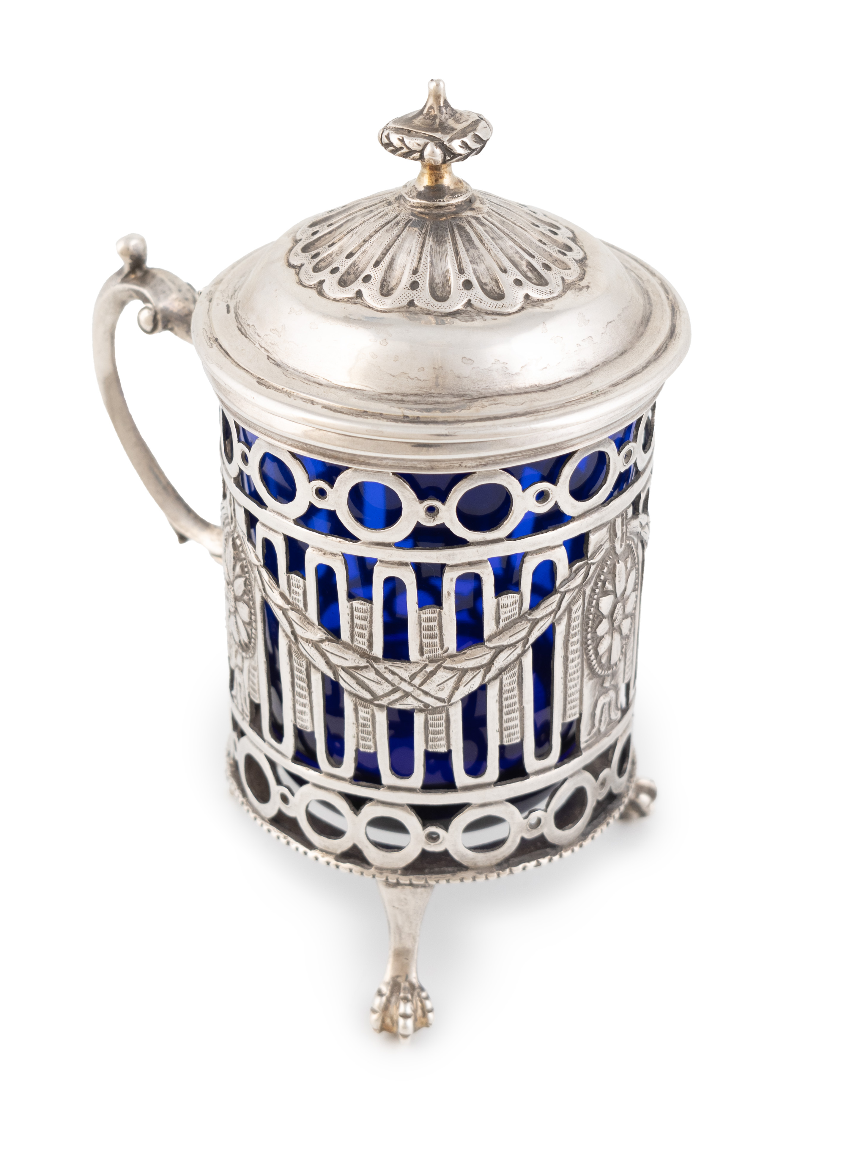circular form with pierced and engraved foliate garland decoration, the domed cover with fluted decoration and knop foliate finial, on three claw and ball feet, with a later blue glass liner, height 13cm, approx. weight 5.1oz.