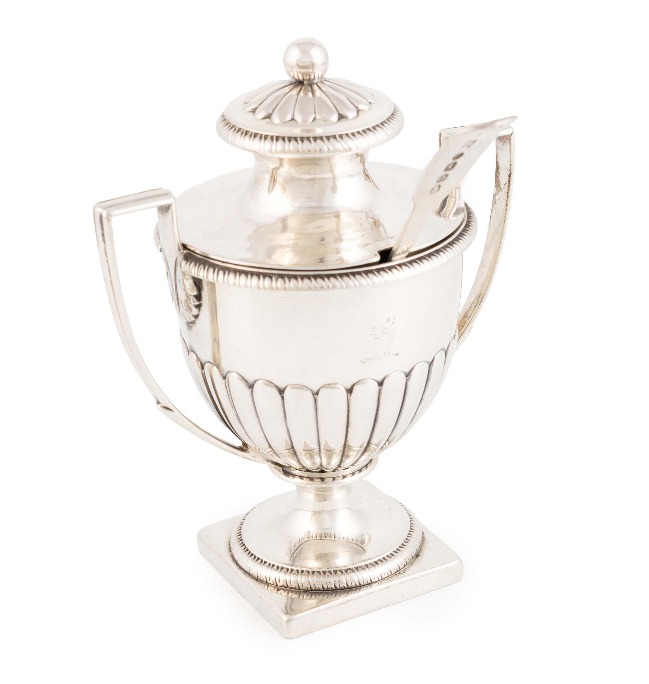 urn form with part-fluted decoration and gadrooned borders, two scroll handles, engraved crest to the cover and body, on a square base, with an associated spoon, height 13.2cm, approx. weight 8.9oz. (2)