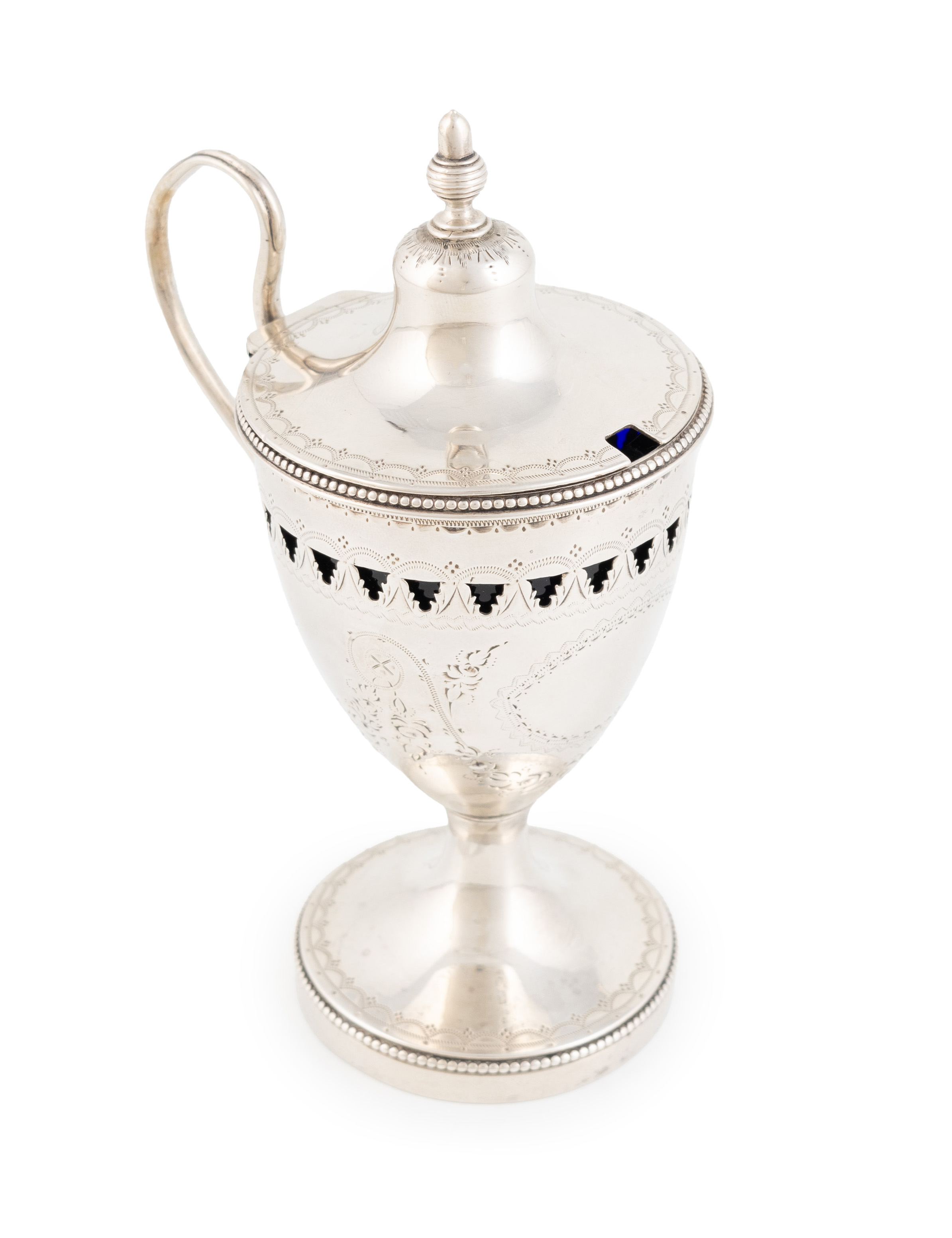 urn form with beaded borders, pierced and engraved with foliate decoration, scroll handle, the hinged cover with an acorn finial, on a raised circular foot, with a blue glass liner, height 13cm, approx. weight 3.7oz