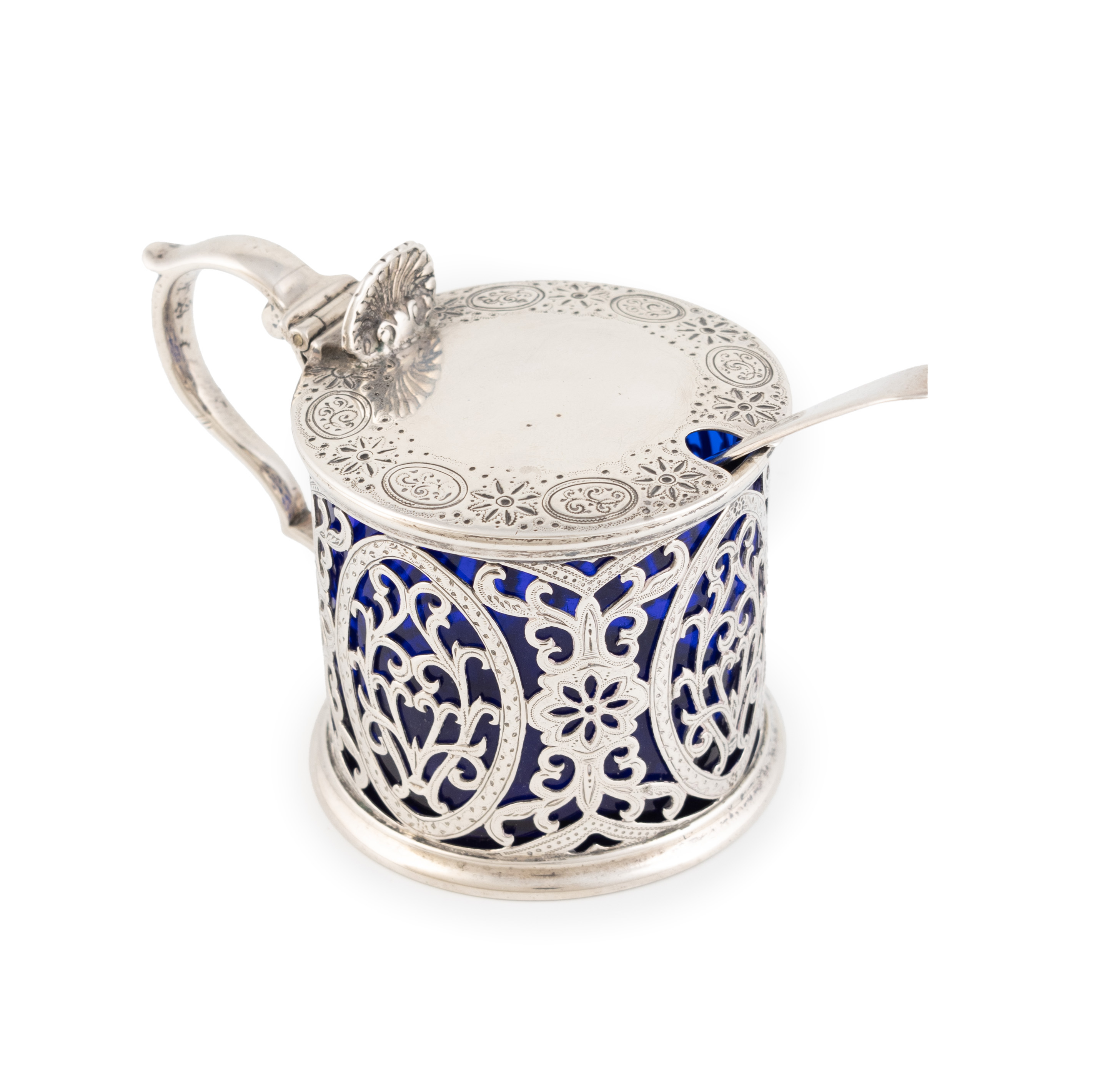 circular form with pierced and engraved scroll foliate decoration, scroll handle, with a blue glass liner and associated spoon, height 6.7cm, approx. total weight 3.4oz. (2)