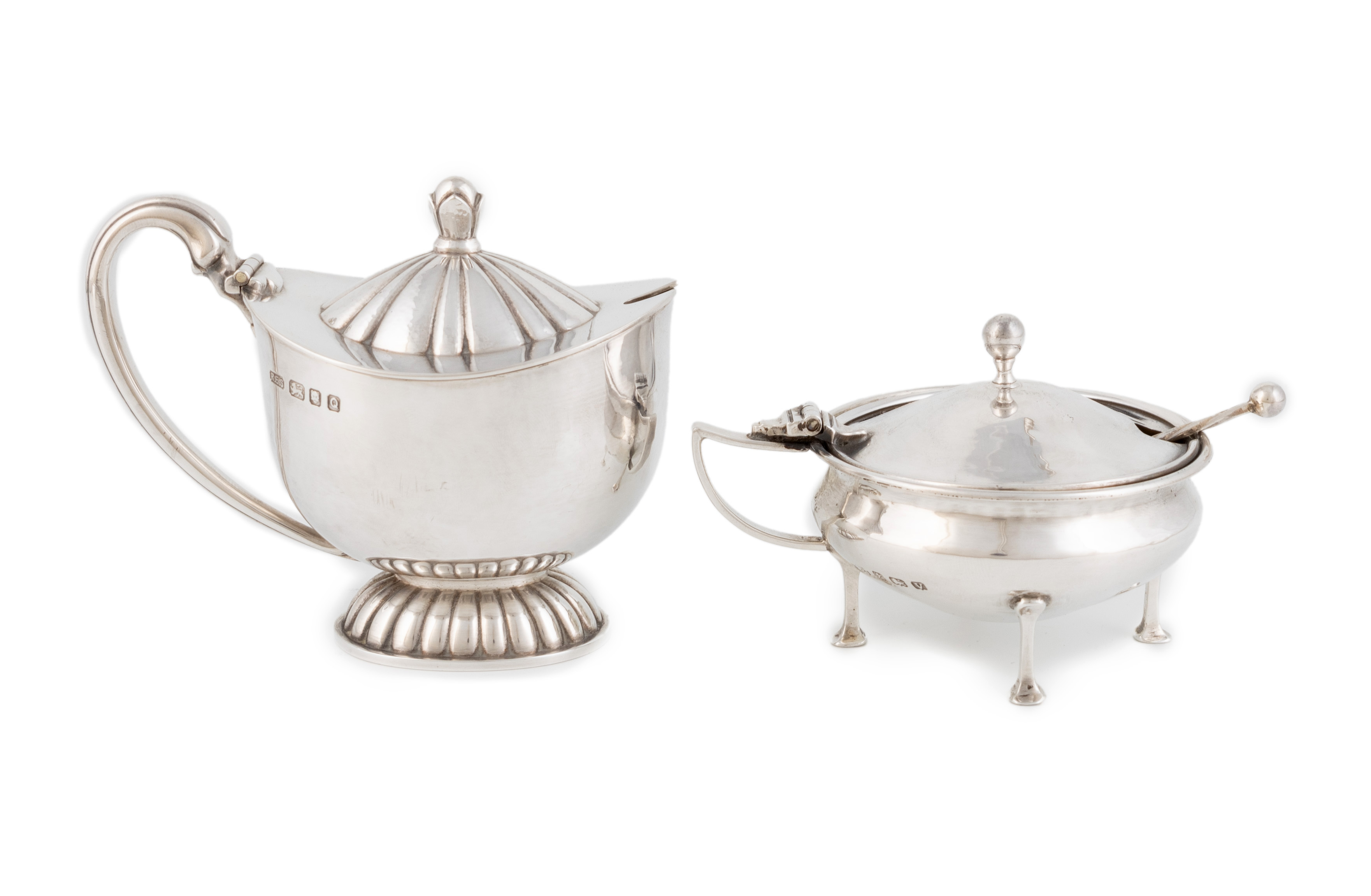 circular bellied form with spot-hammered decoration, the cover with a ball finial, a ceramic interior liner, on four pad feet with an earlier spoon, plus a modern silver mustard pot by Robert Stone, London 1951, tapering oval form, domed fluted cover with a bud finial, on a raised fluted oval foot, with a blue glass liner, height 8.4cm, approx. total weight 8oz. (3)