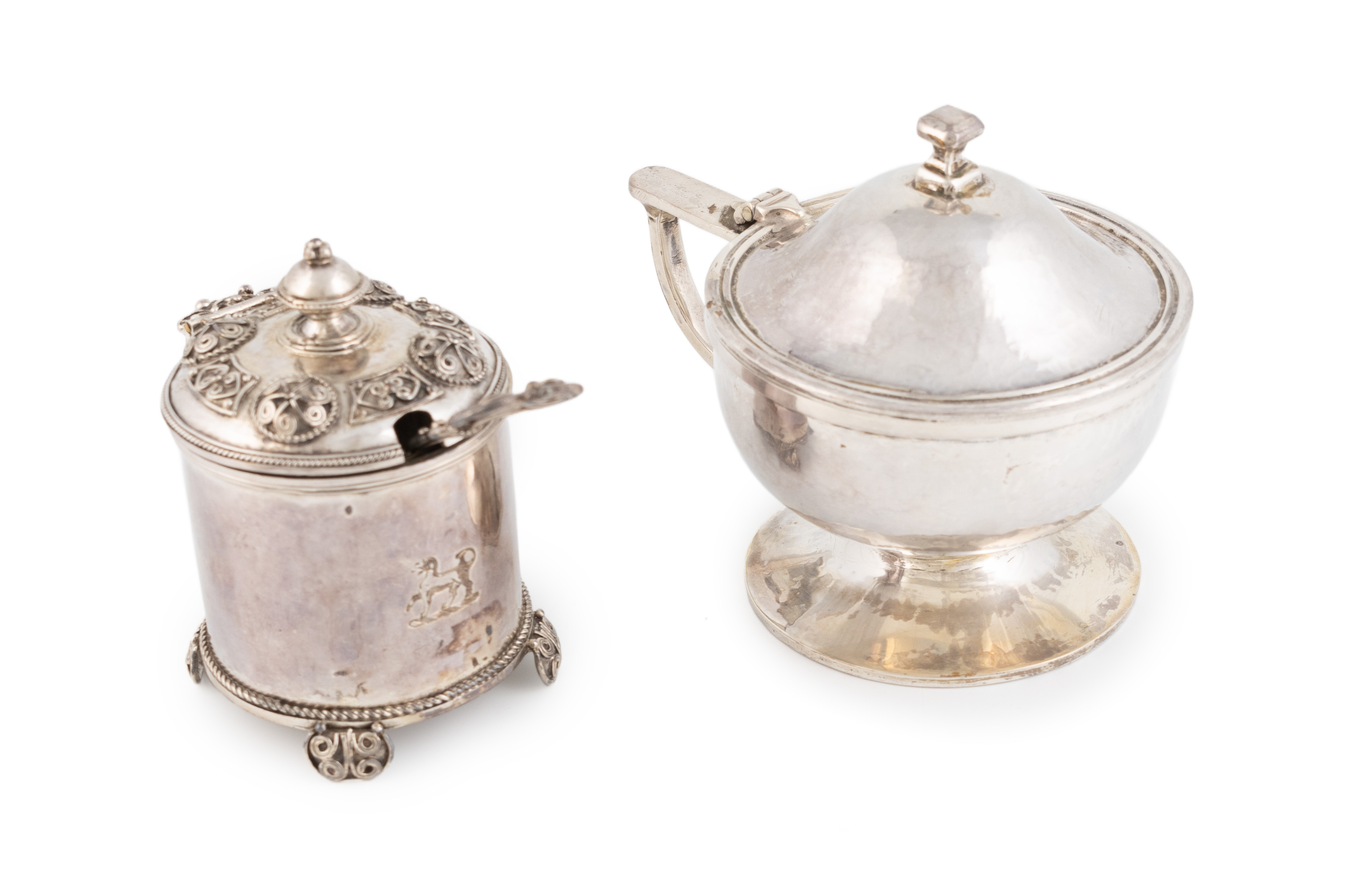 tapering circular form with spot-hammered decoration, gilded interior liner, on a raised circular foot, plus a modern silver mustard pot stamped by the London Assay Office, London 2012, circular form with ropework borders and wirework decoration, with a clear glass liner and spoon, approx. total weight 10.3oz. (3)