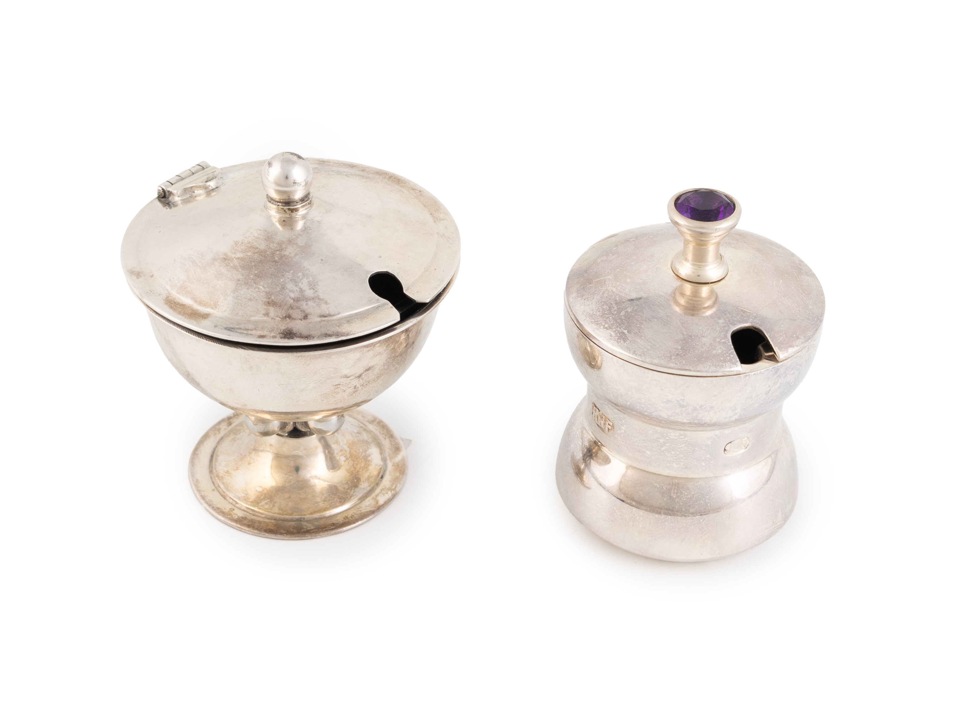 tapering circular form with spot-hammered decoration, green glass liner, on a raised circular four-ball knopped foot, plus a modern silver mustard pot by Richard Fox, London 2008, plain spool-shaped form, hinged cover with a gemstone finial, and a blue glass liner, approx. total weight 6.3oz. (2)