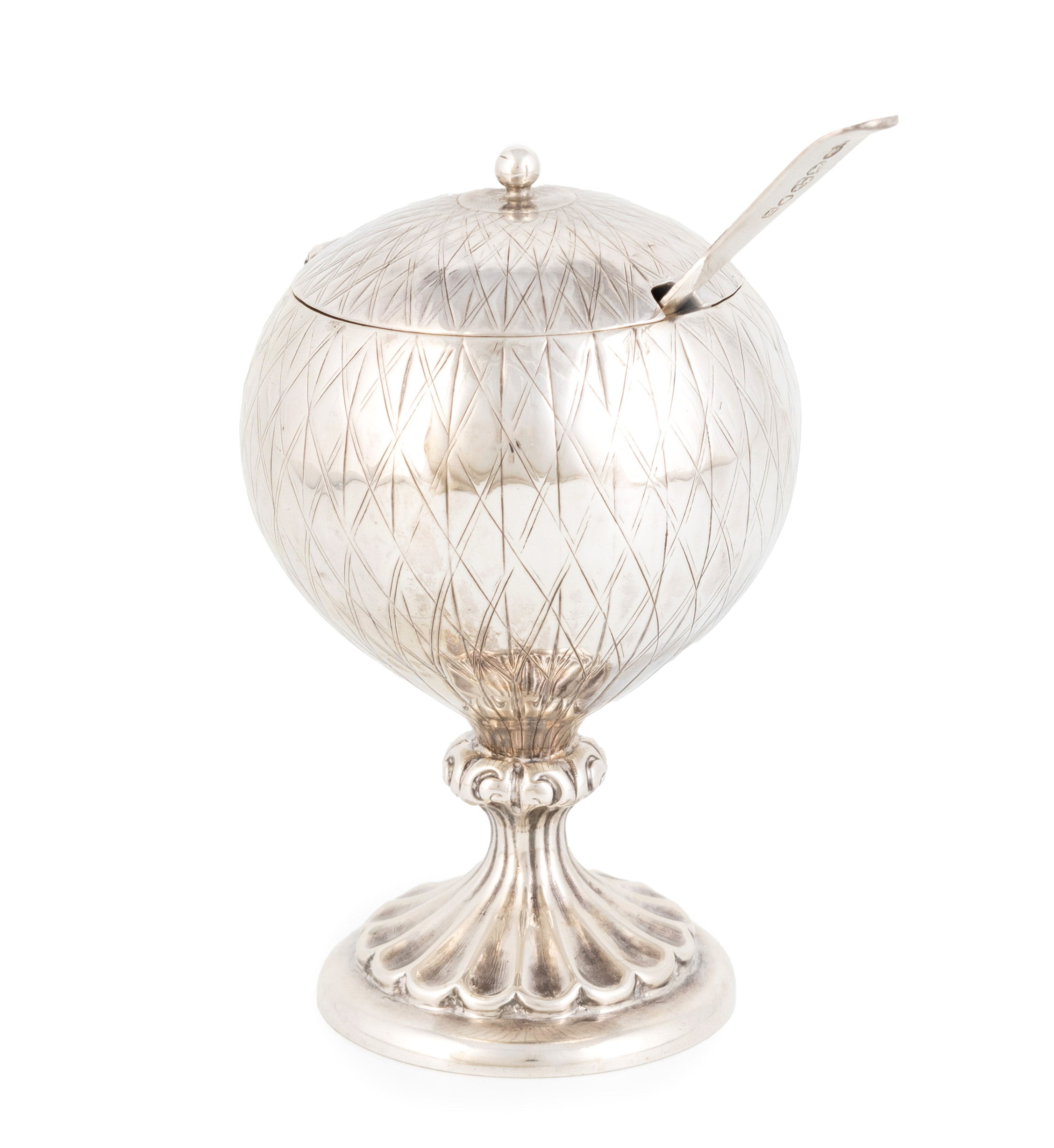 resembling a hot air balloon with engraved decoration, gilded interior, on a raised knopped fluted foot, with an associated spoon, height 12.8cm, approx. total weight 6.4oz. (2)
