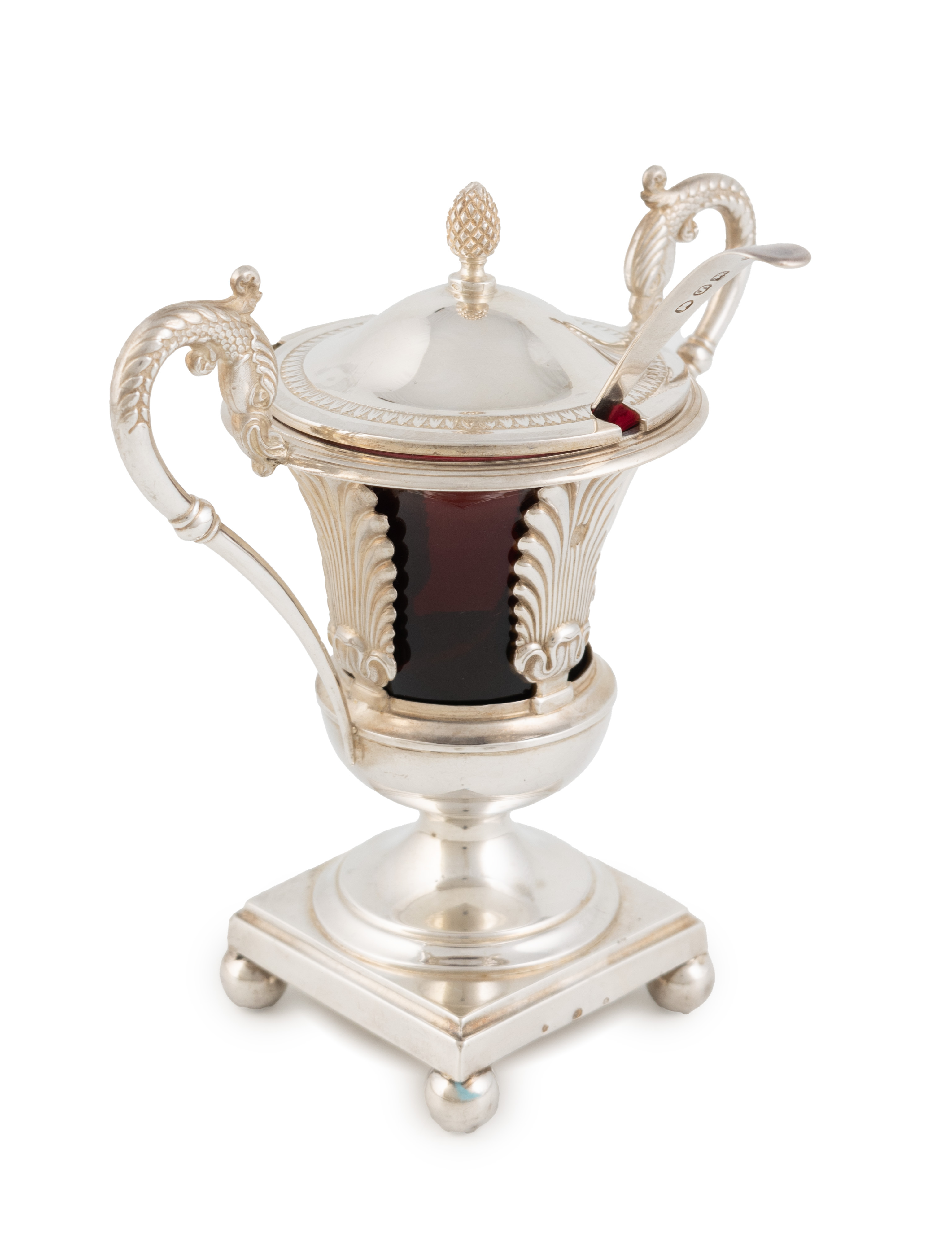 campana vase form, leaf-capped scroll handles, the hinged cover with a cone finial, on a square base, with a red glass liner and later English spoon, height 13.5cm, approx. weight 5.3oz. (2)