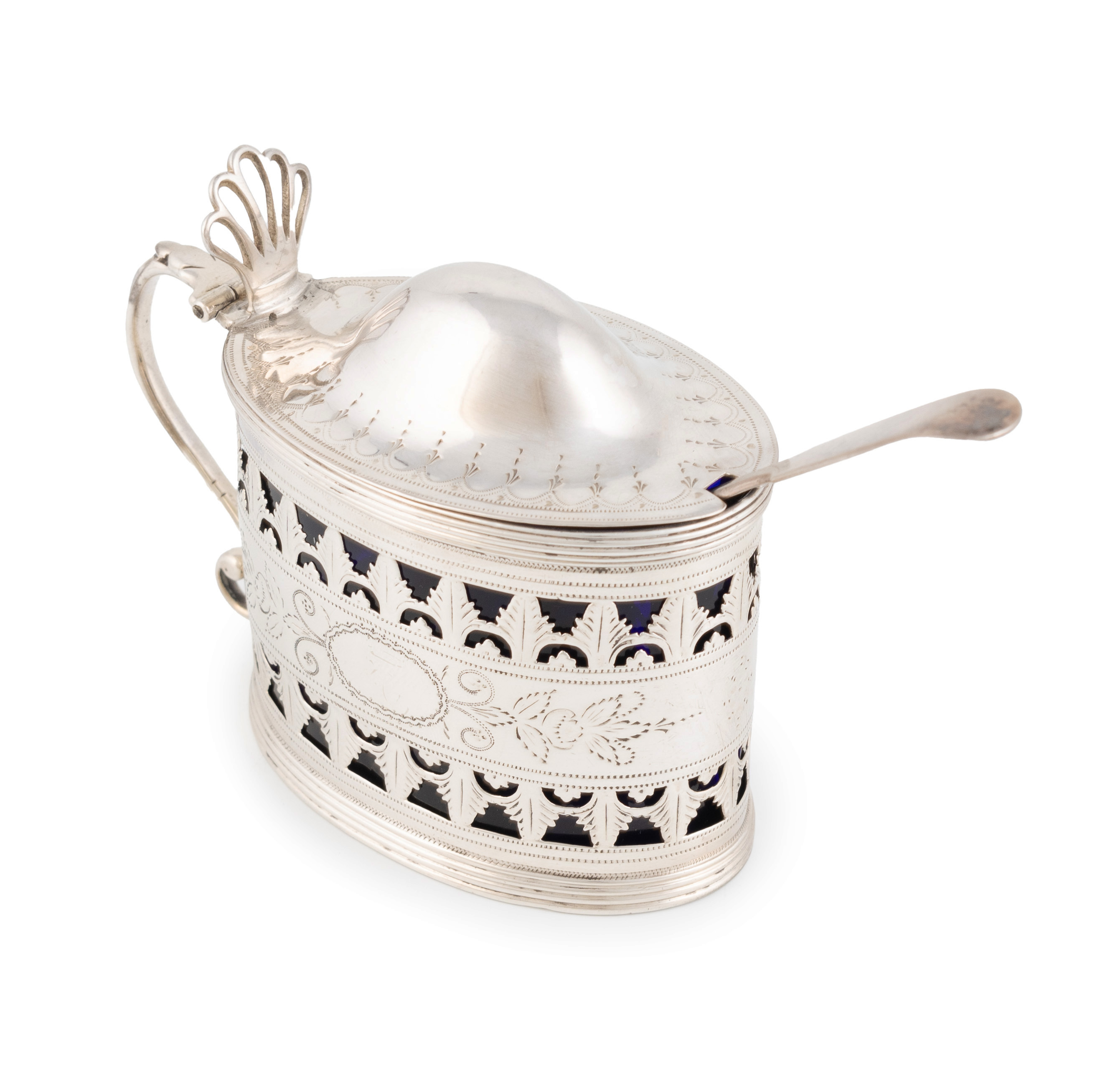oval form with pierced and engraved foliate bands of decoration, scroll handle, with a blue glass liner and associated spoon, length 10.4cm, approx. total weight 3.8oz. (2)