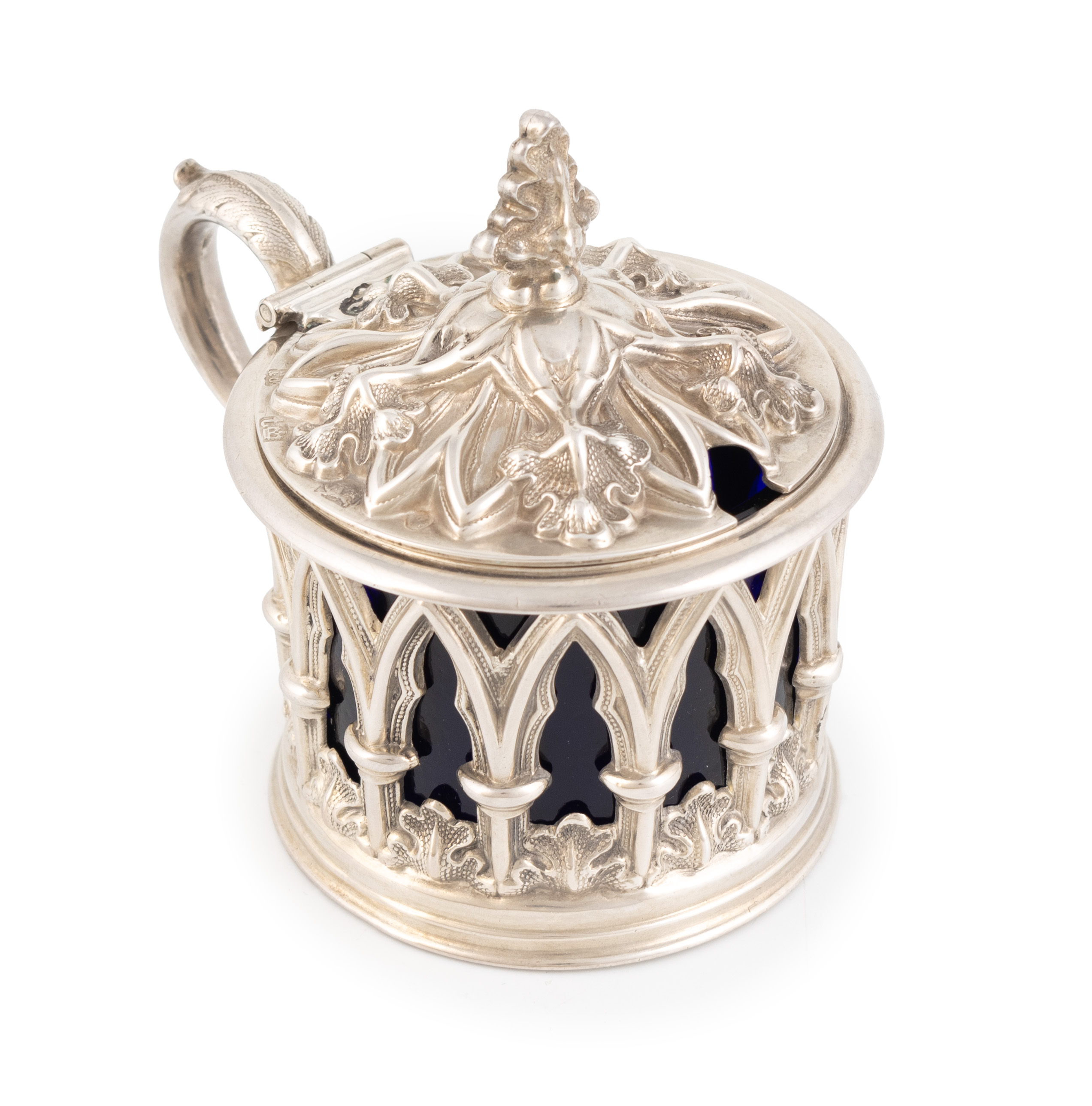 circular form, with pierced Gothic arches, the cover with a moulded Gothic cover with a stylised leaf finial, scroll handle, with a blue glass liner, height 9cm, approx. weight 3.6oz.