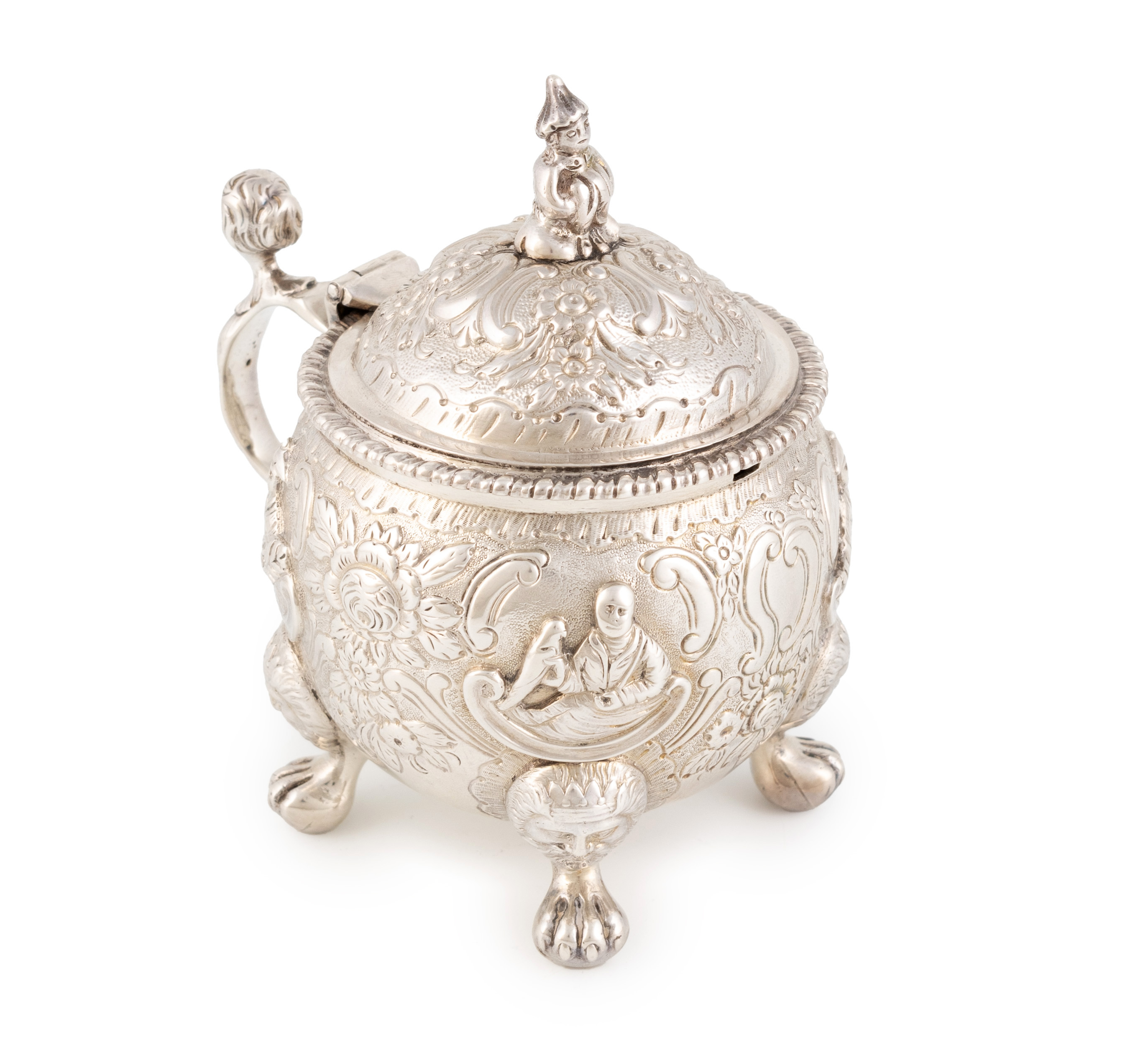 circular form with embossed scroll foliate decoration with applied chinoiserie figures in cartouches, the domed cover with embossed foliate decoration with a chinoiserie figure finial, caryatid scroll handle, gilded interior, on four beard masked capped paw feet, height 11.4cm, approx. weight 9.7oz.