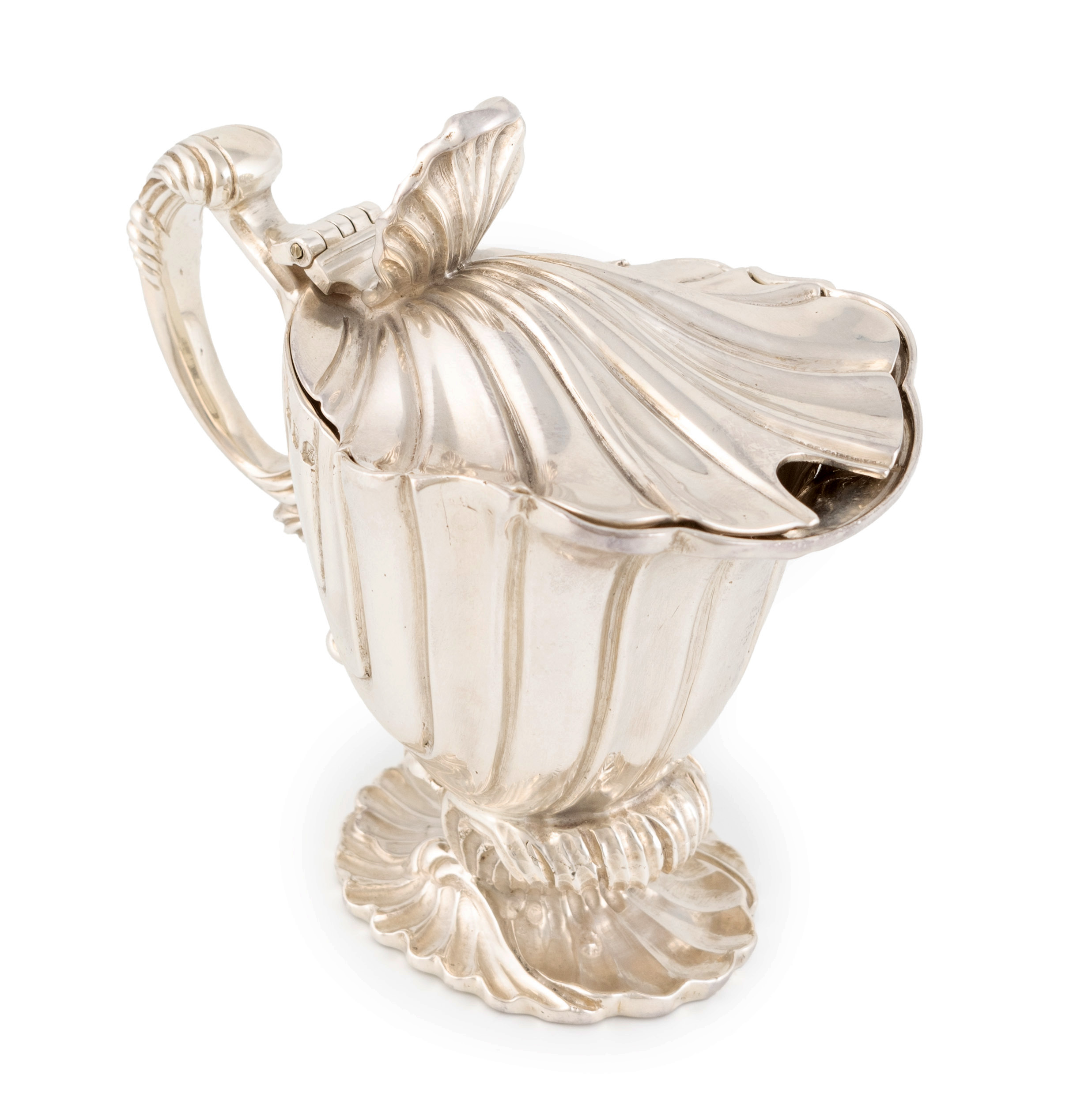 of shell form with shell fluting, scroll handle, on a shaped fluted wave foot, height 10.4cm, approx. weight 11.6oz.