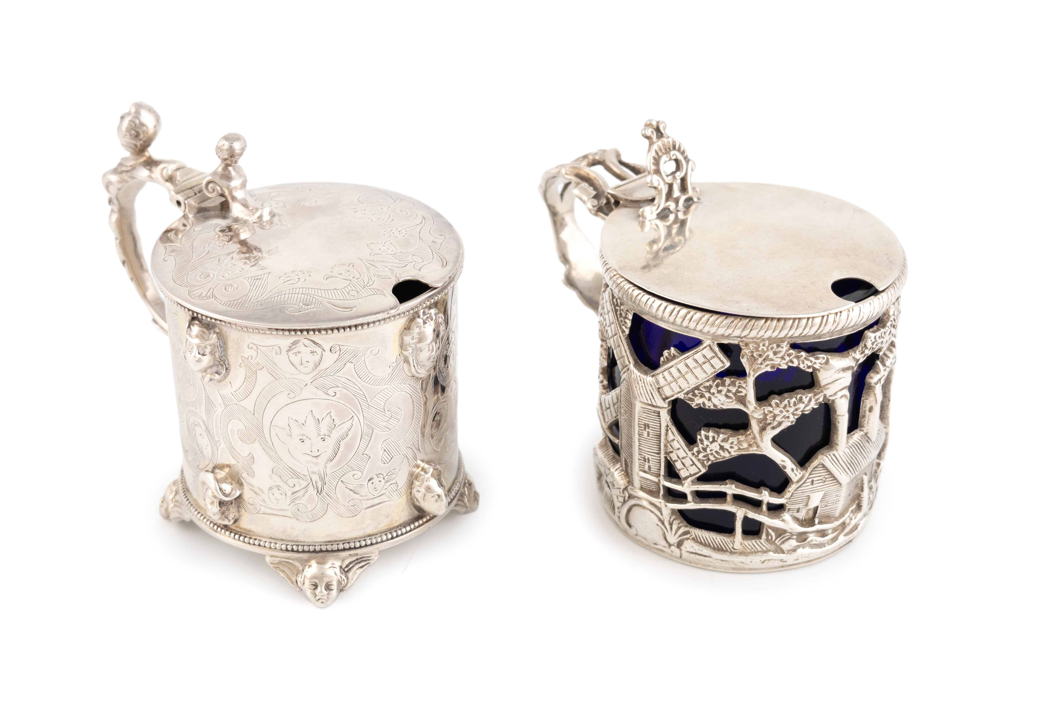 circular form with engraved scroll and mask decoration, applied masks to the body, caryatid scroll handle, on four winged cherub mask feet, with a later blue glass liner, plus a silver mustard pot by Wakely & Wheeler, London 1911, circular form with a pierced rural scene, with a blue glass liner, approx. total weight 8.5oz. (2)