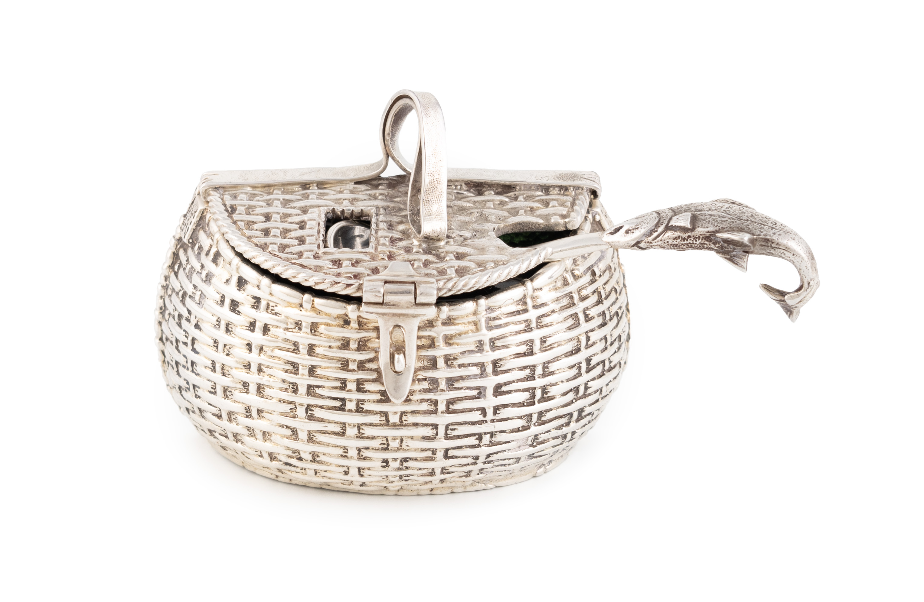 modelled as a fishing wicker creel, textured decoration, with a green glass liner, the unmarked spoon with a fish finial, length 8cm, approx. weighable 7.4oz. (2)
