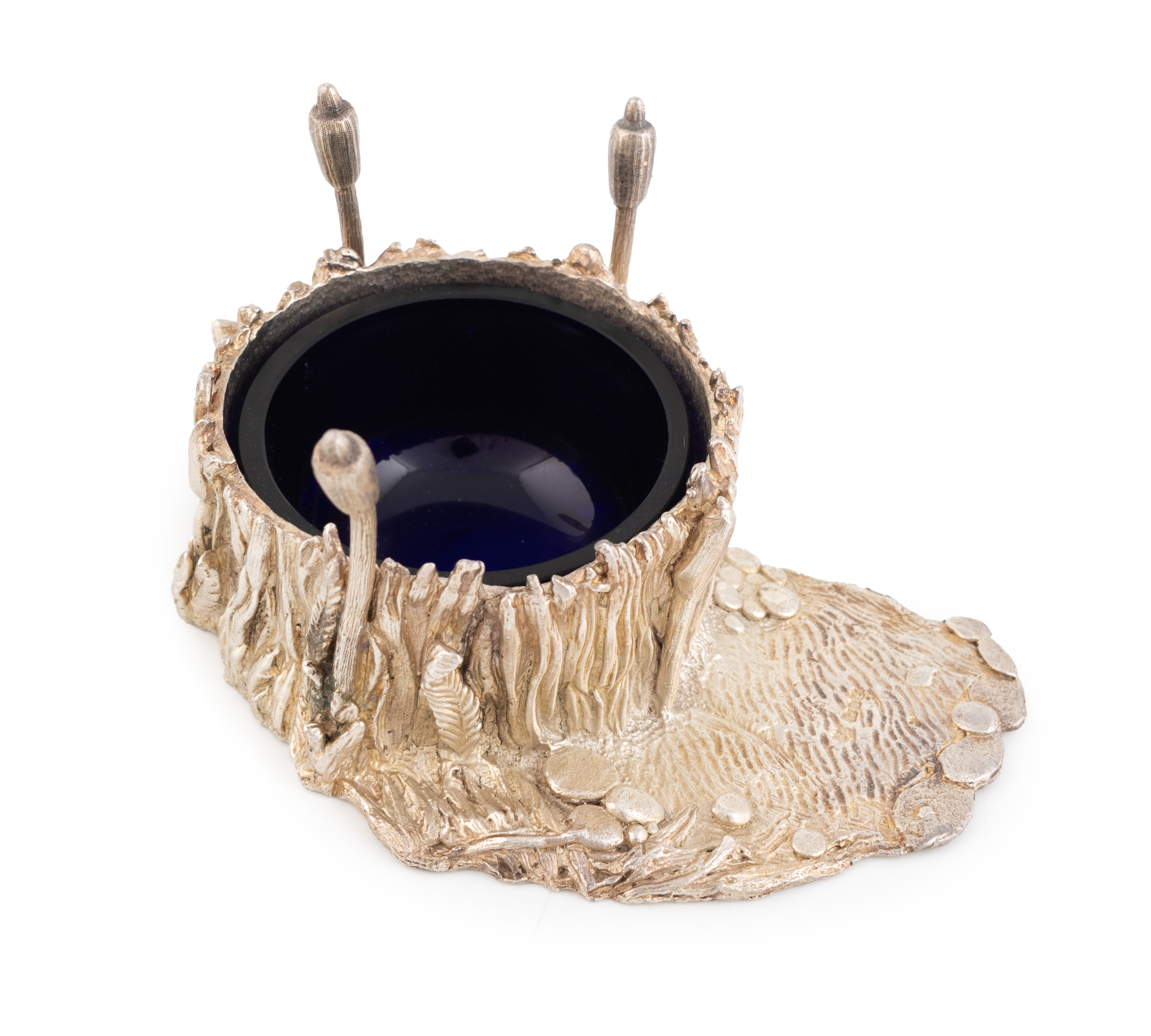 in the form of a pond scene, with a raised bowl decorated with reeds and cattails, and a later blue glass liner, length 10.2cm, approx. weight 9.4oz.