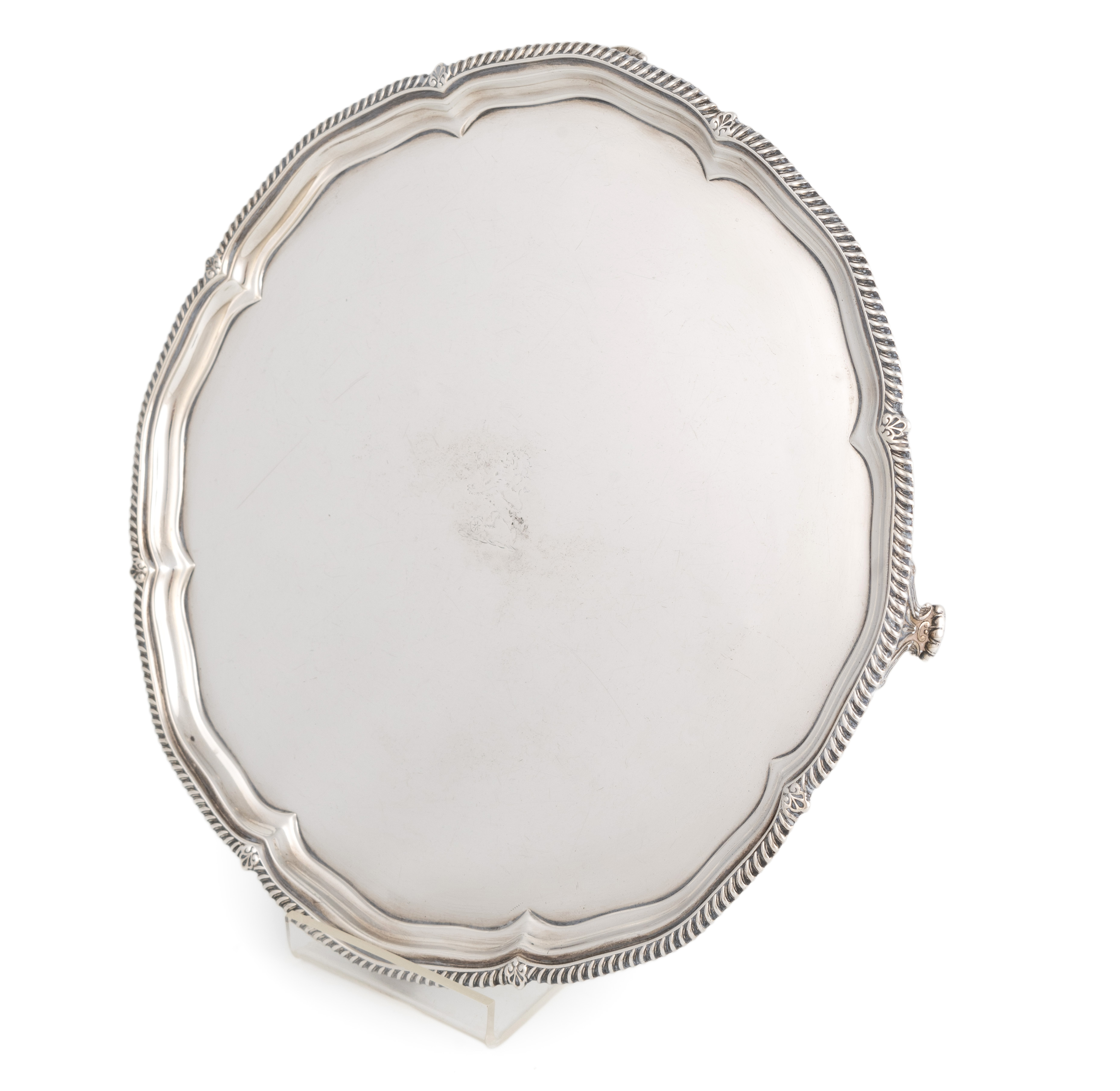 circular form, gadroon border, the centre with a crest, on four bracket feet, diameter 24.8cm, approx. weight 15oz.