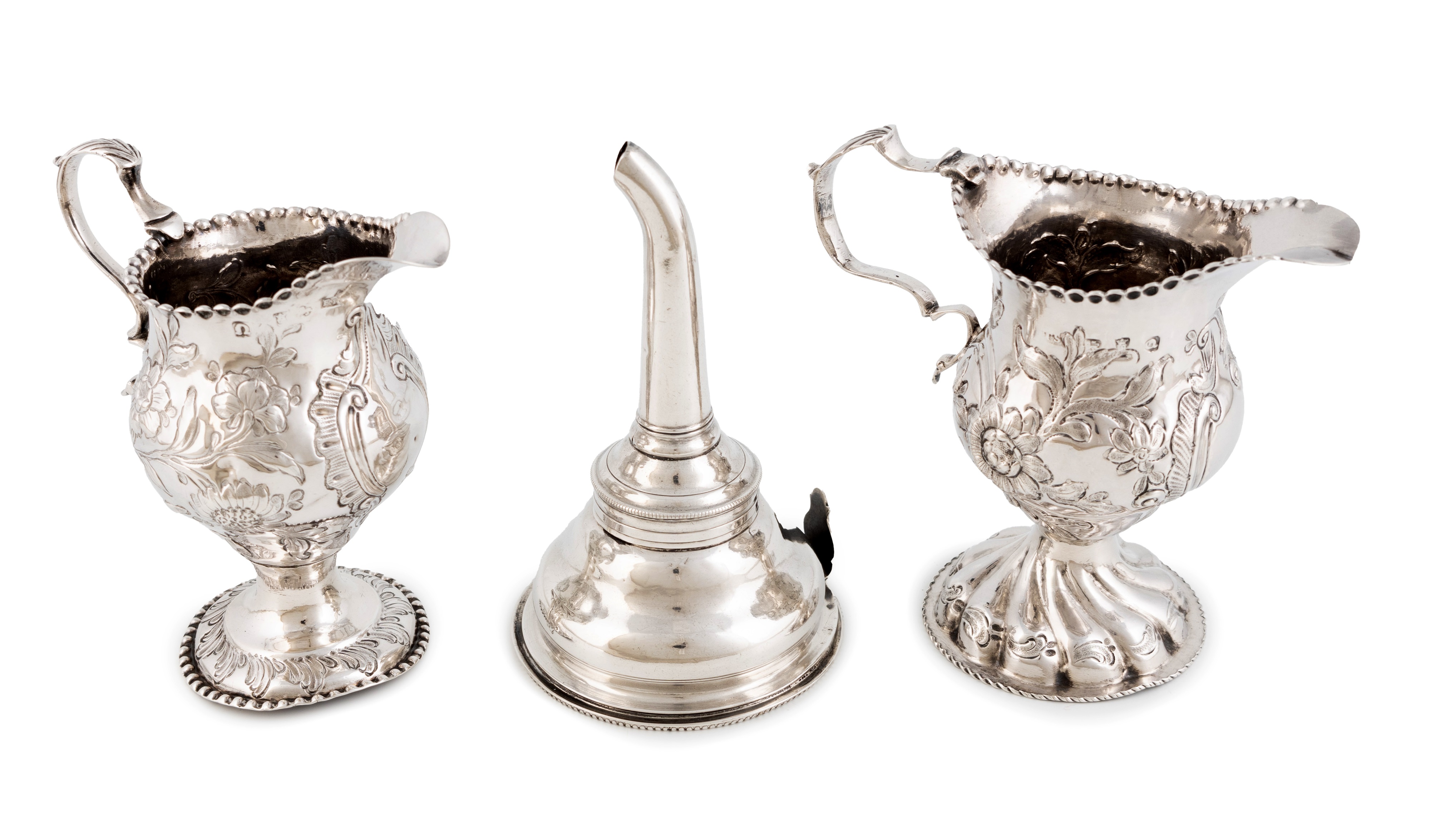 circular form, with a side clip and later unmarked muslin ring with a beaded border, length 11.5cm, plus two George III silver cream jugs, London 1768 and 1771, baluster form, embossed foliate decoration, punch bead borders, approx. total weight 6.9oz. (3)