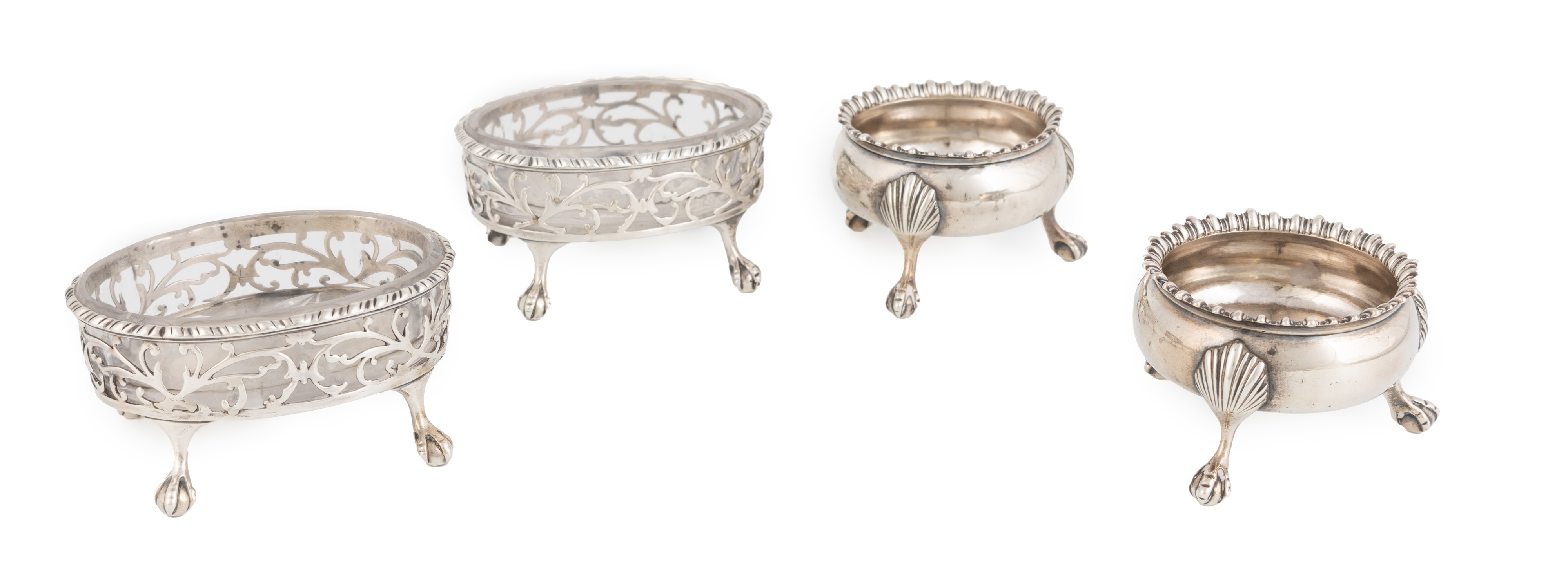 oval form with gadrooned borders, pierced scroll decoration, later clear glass liners, on four claw and ball feet, length 9.4cm, plus a pair of George III silver salt cellars by David & Robert Hennell, London 1768, total approx. weight 11.2oz. (4)