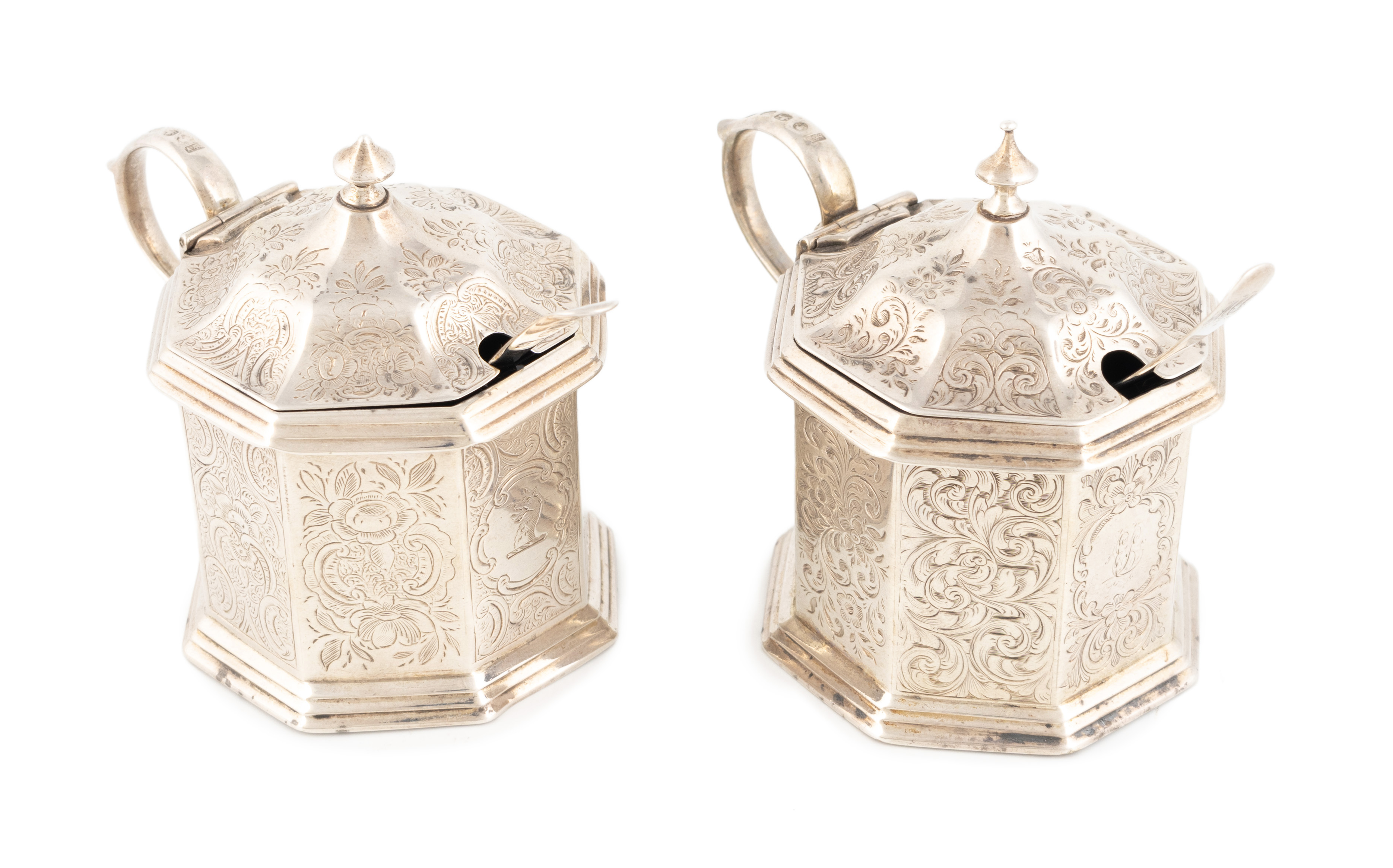 octagonal form, engraved foliate decoration, scroll handles, hinged covers, one with initials, the other with a crest, with two blue glass liners and two George III condiment spoons, approx. weight 7.3oz. (4)