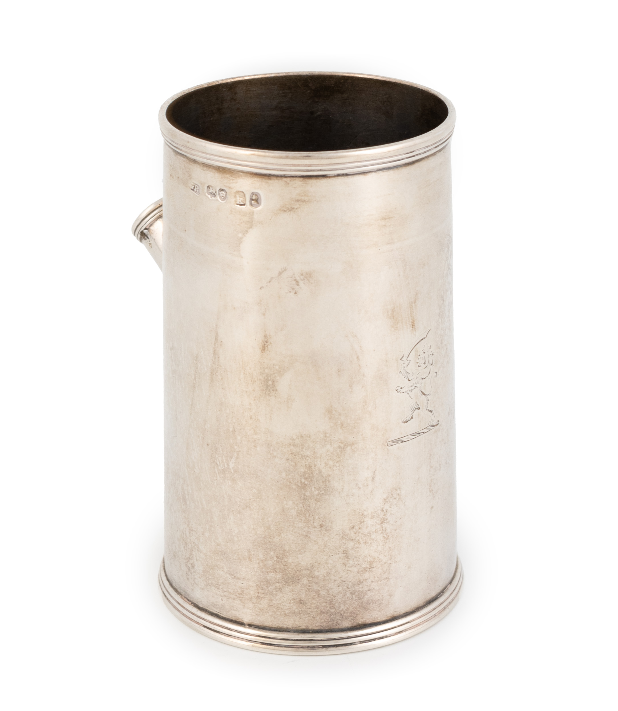 tapering circular form, reeded borders, lacking side handle, engraved with a crest, the underside inscribed 'Presented by Mrs Evans to Horace C Pilcher Esq. 28 December 1869, This pot was formerly the property of Sheriff William Evans', height 11.3cm, approx. weight 7.5oz.
