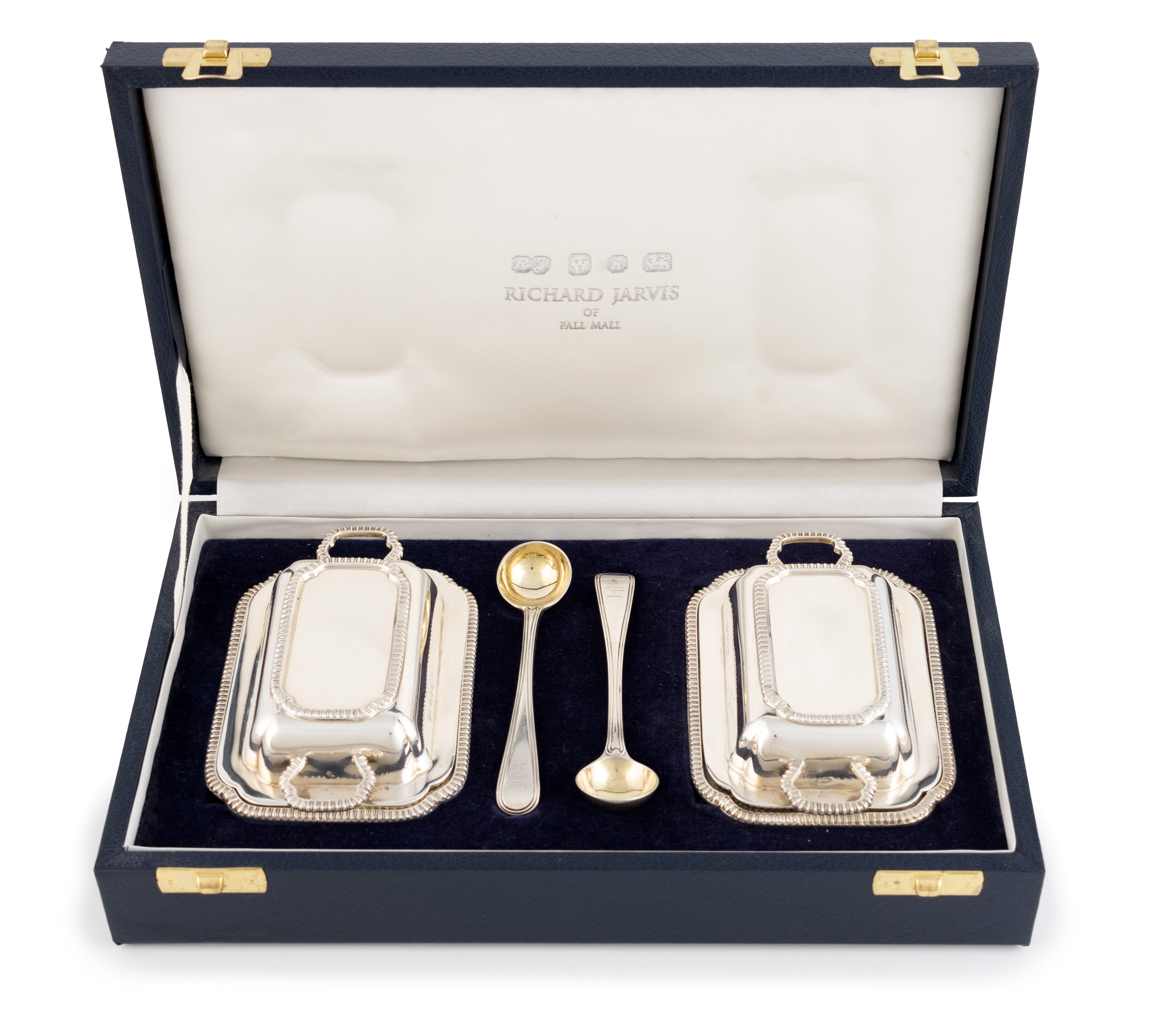 rectangular form, gadroon borders, gilded interiors, with two Victorian silver salt spoons, in a later fitted case retailed by Richard Jarvis, length 10.6cm, approx. weight 10.5oz. (4)