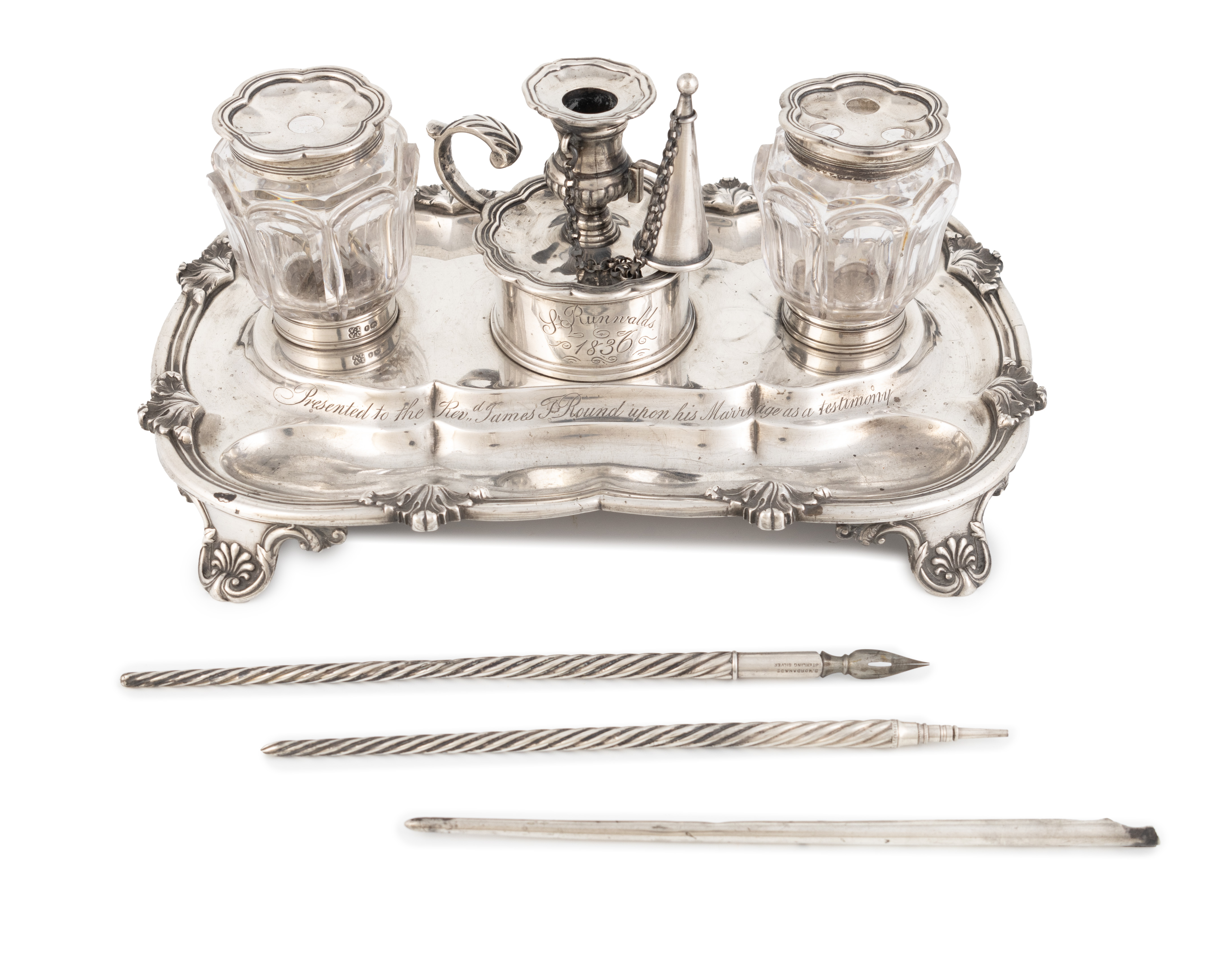 rounded rectangular form with a reeded and foliate border, two moulded pen trays, two silver-mounted inkwells and a central pull-off chamberstick and snuffer, inscribed 'Presented to the Rev,,d James T Round upon his marriage as a testimony of affection from his Parishoners with their united wishes for his happiness', on four-scroll foliate bracket feet, length 26cm, plus a silver dip pen and pencil by Sampson Mordan & Co. and another similar, total approx. weighable 25.7oz. (4)