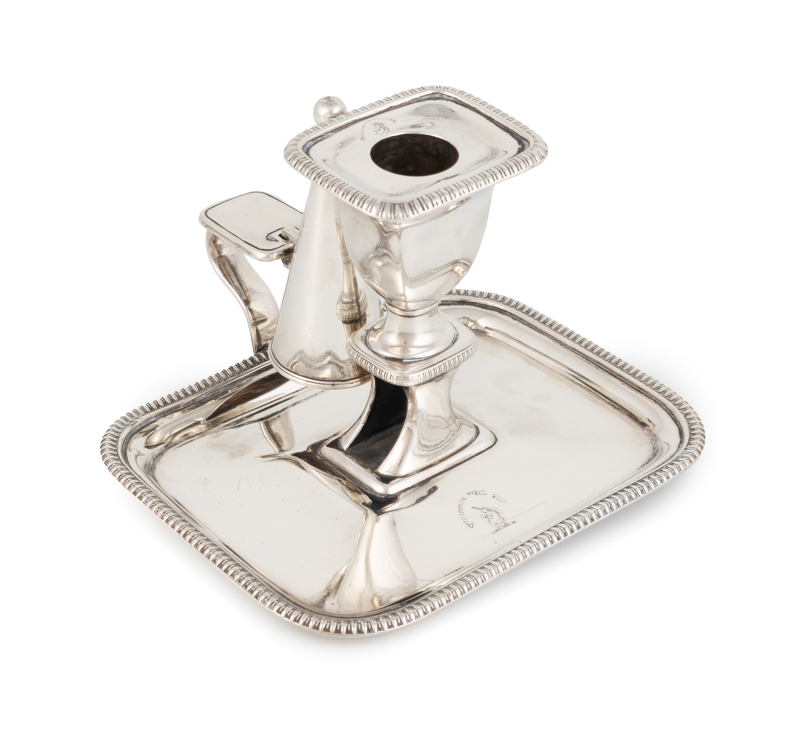 rounded rectangular form with a gadrooned border, urn-shaped capital, engraved with crest and motto, pull-off conical snuffer, length 15.3cm, approx. weight 10.7oz.
