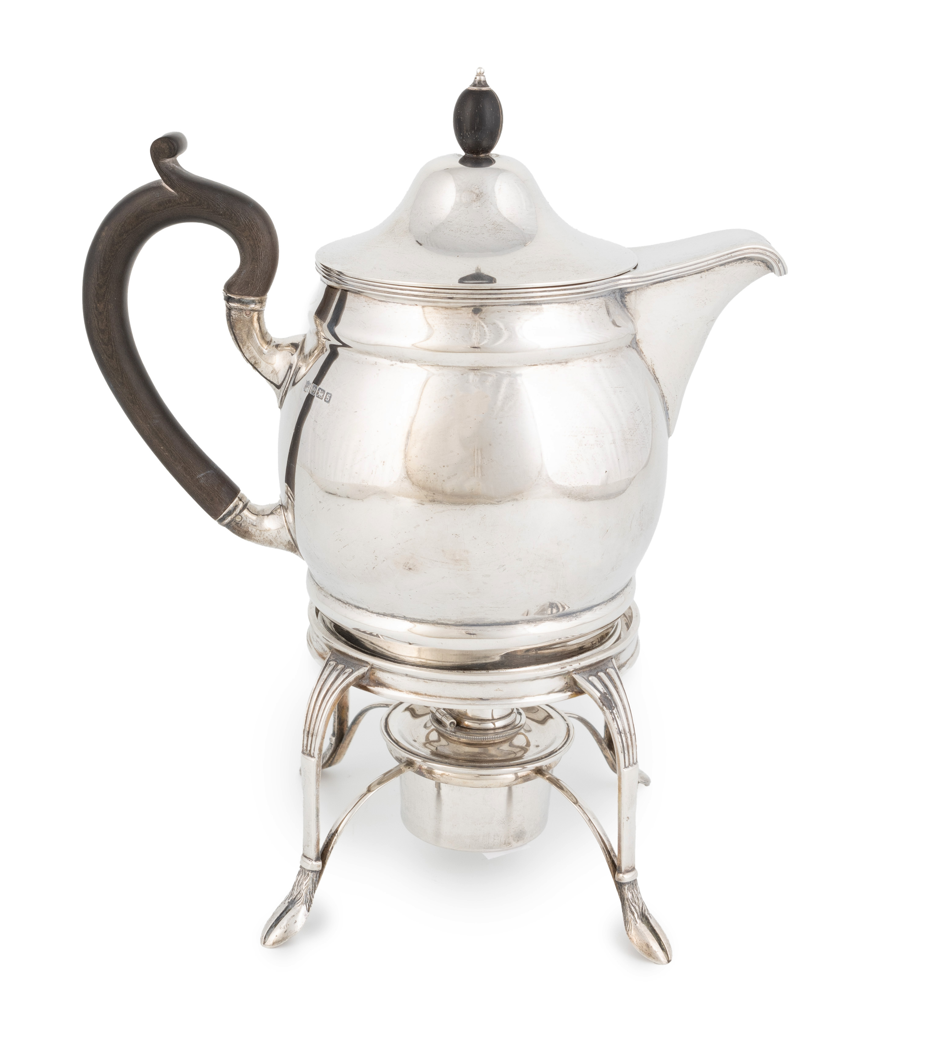 circular form, scroll handle, the cover with a coffee bean finial, the stand on four scroll legs, with a burner, height 26cm, approx. weight 29.6oz.