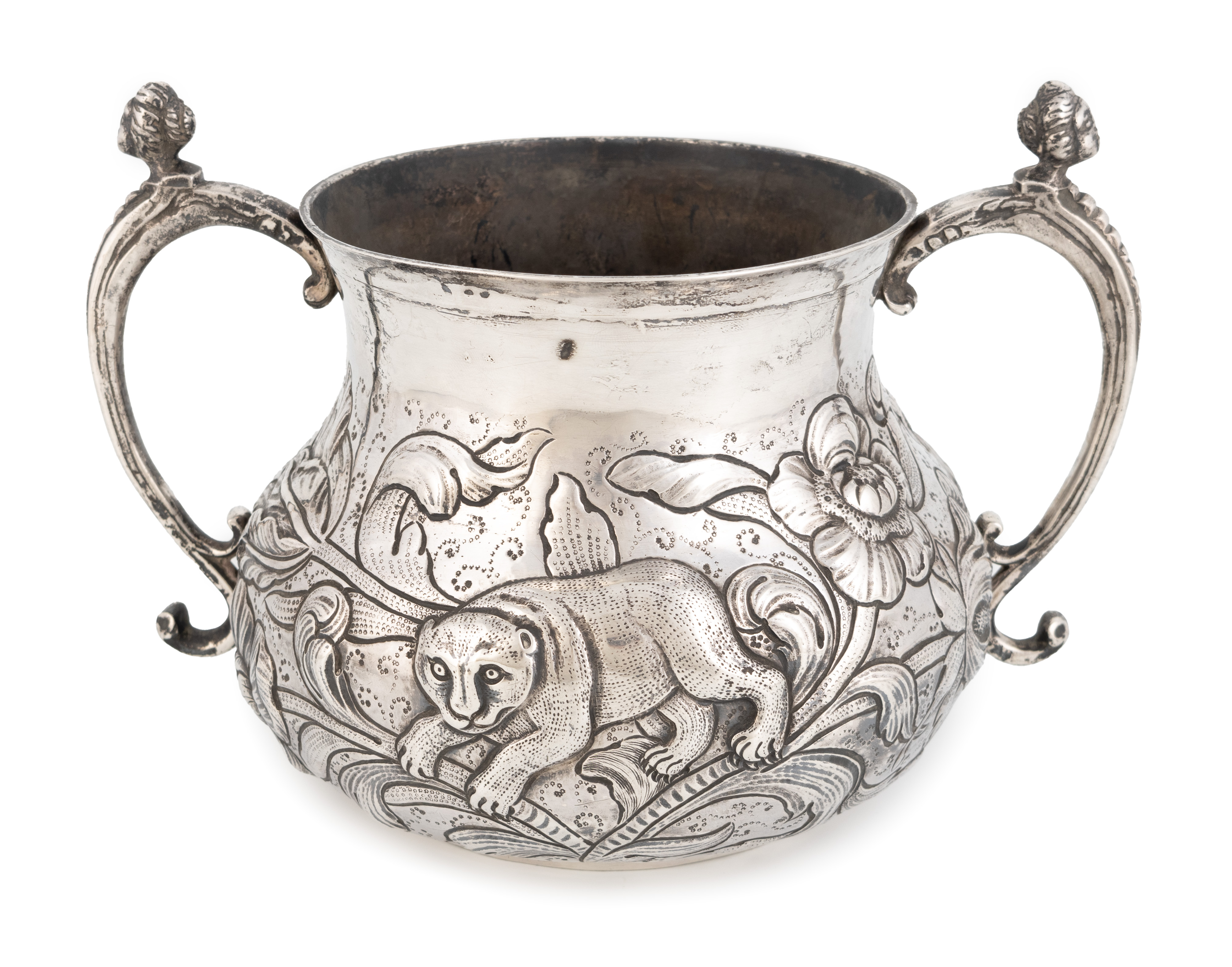 in the Charles II manner, circular bellied form, embossed with a stag, leopard and foliate decoration, caryatid scroll handles, height 16cm, approx. weight 23.5oz.