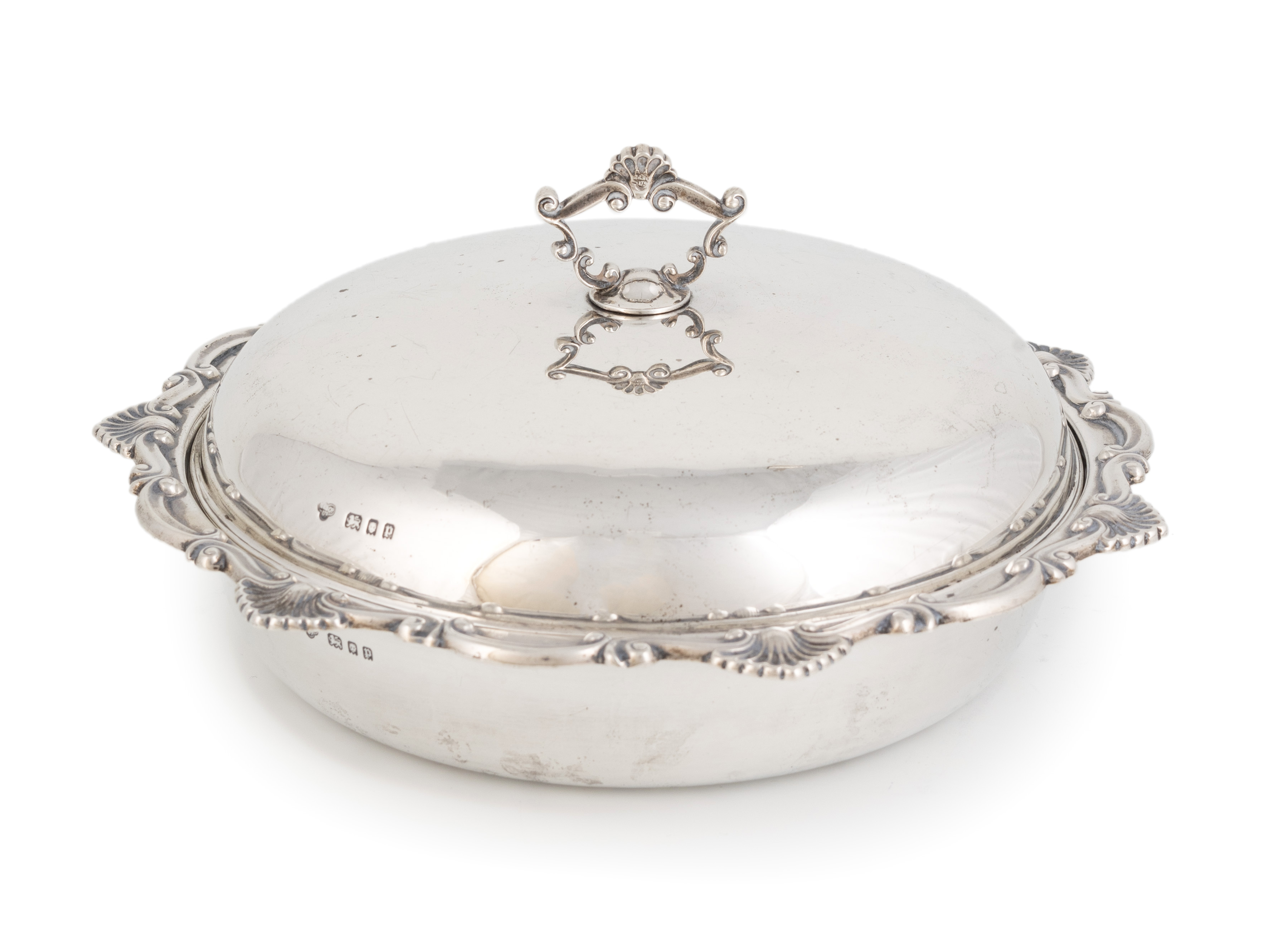 circular form, shell and scroll border, domed cover with a pierced scroll handle, diameter 21.5cm, approx. weight 20.8oz.