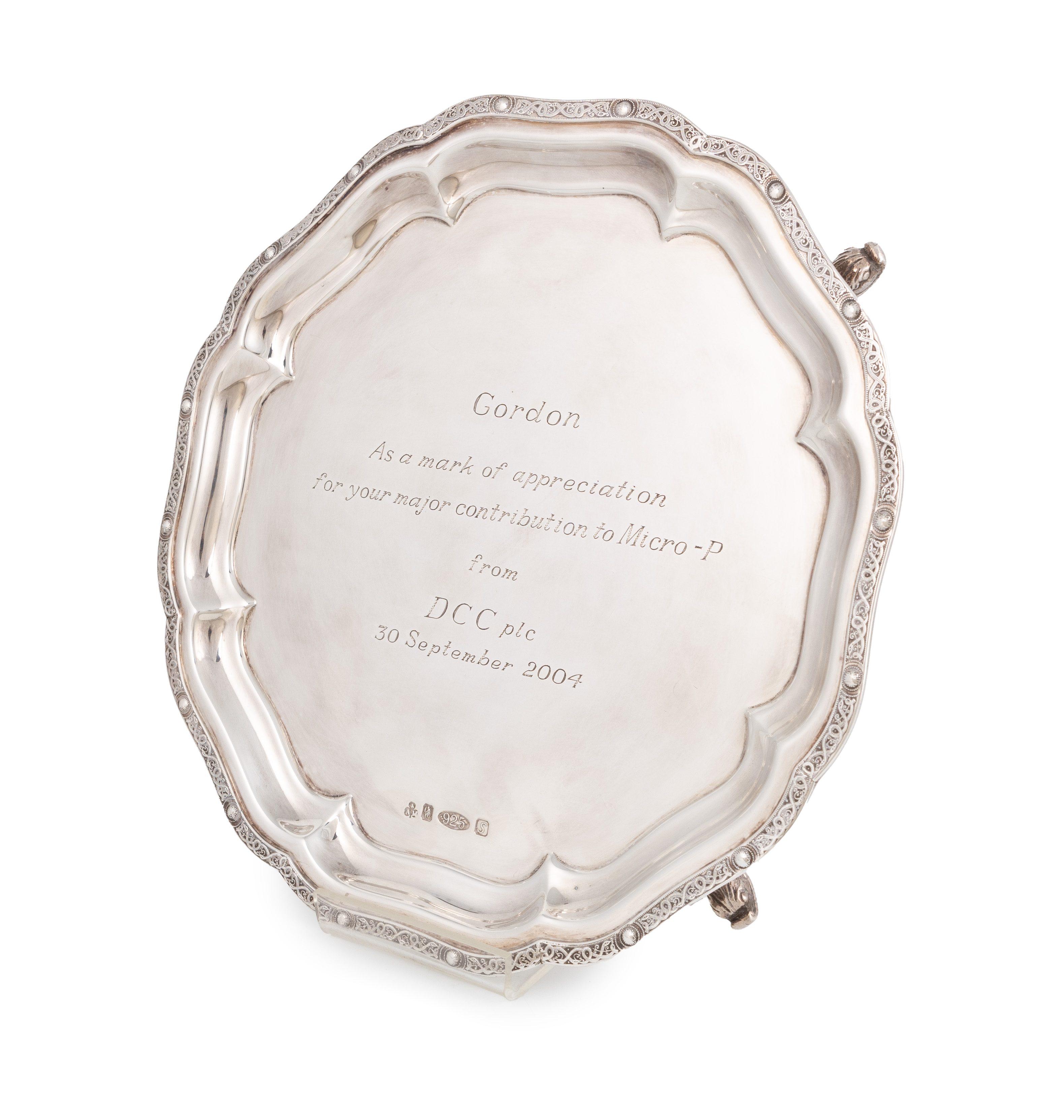 shaped circular form with a Celtic scroll decorative border, engraved 'Gordon As a mark of appreciation for your major contribution to Micro-P from DCC plc 30 September 2004', on four scroll feet, diameter 24.7cm, approx. weight 23oz.