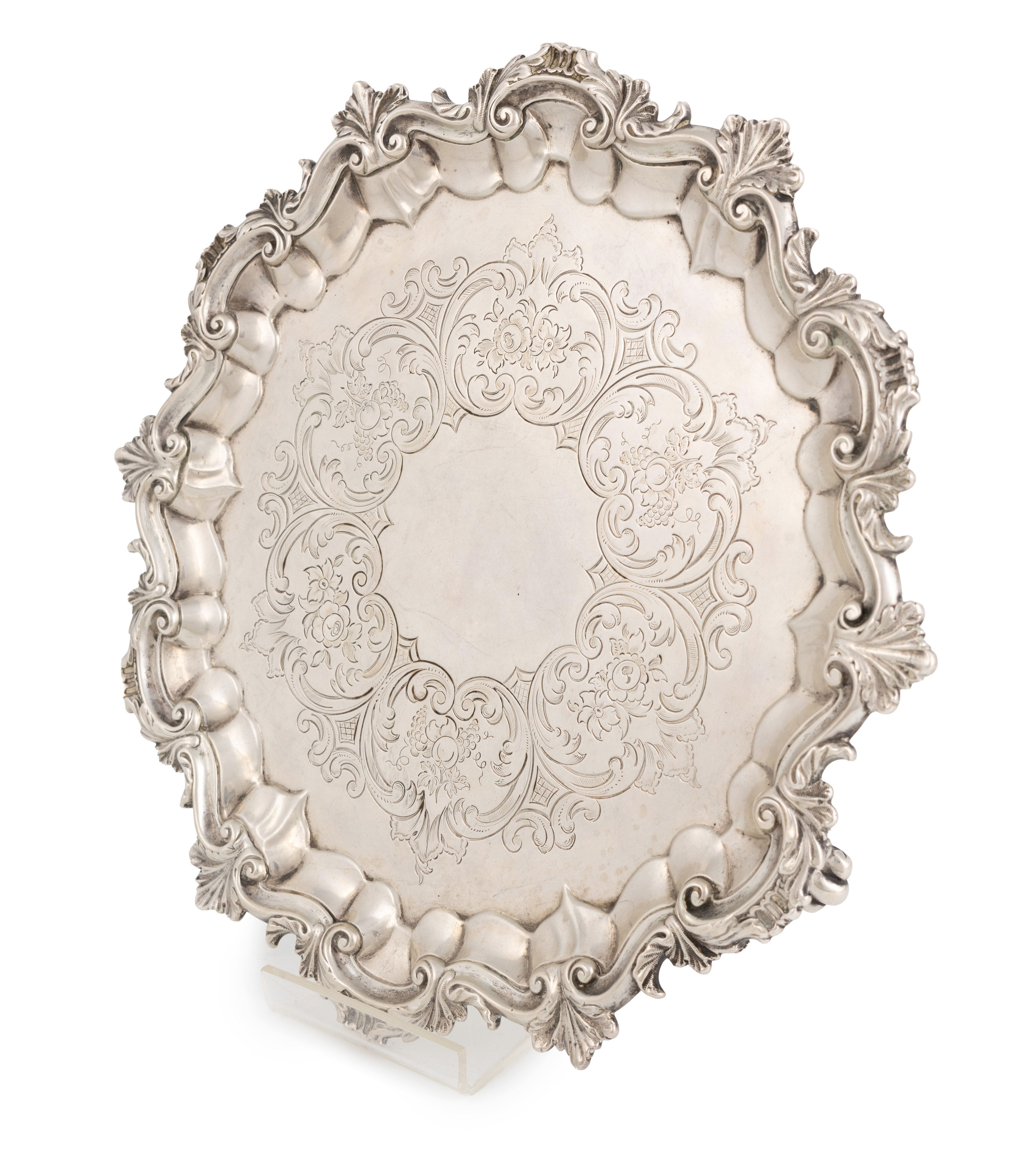 circular form, shell and scroll border, the centre with chased decoration, on three foliate bracket feet, diameter 27cm, approx. weight 21oz.