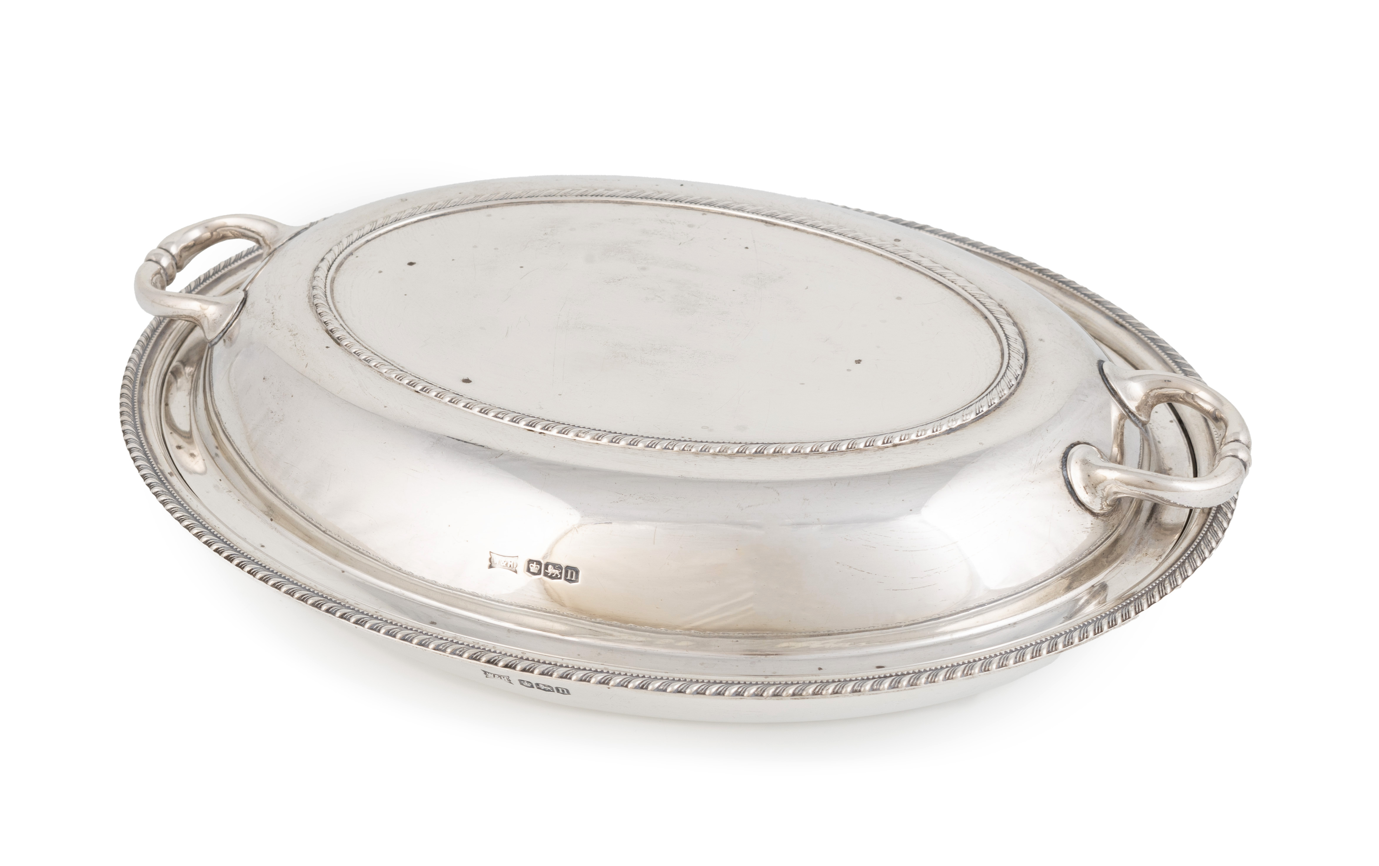 oval form, gadroon borders, the cover with side handles, length 27.6cm, approx. weight 31.9oz.