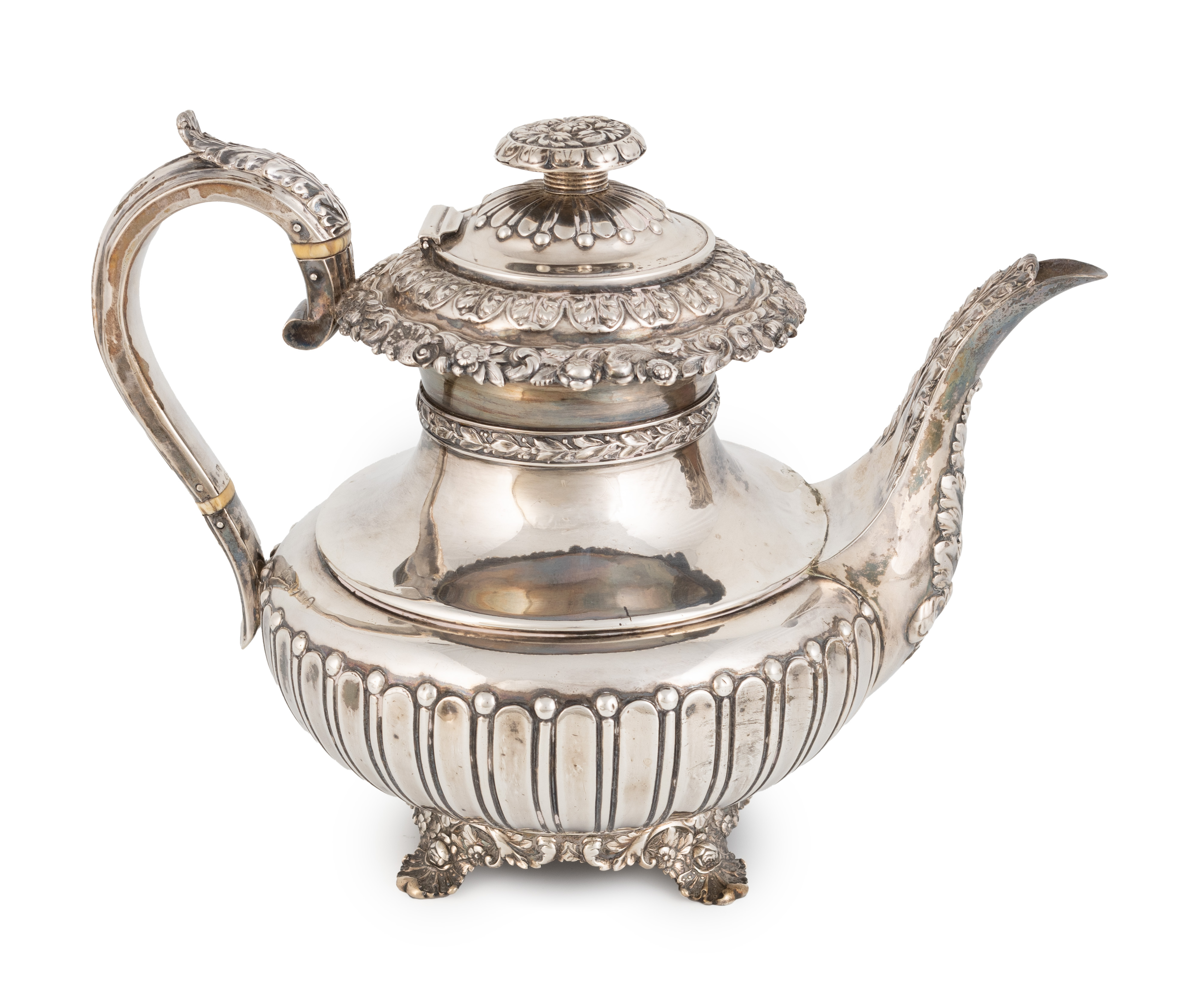 circular bellied form with part-fluted decoration, foliate borders, scroll handle with ivory insulators, on four foliate bracket feet, length spout to handle 26.2cm, approx. weight 27.6oz.