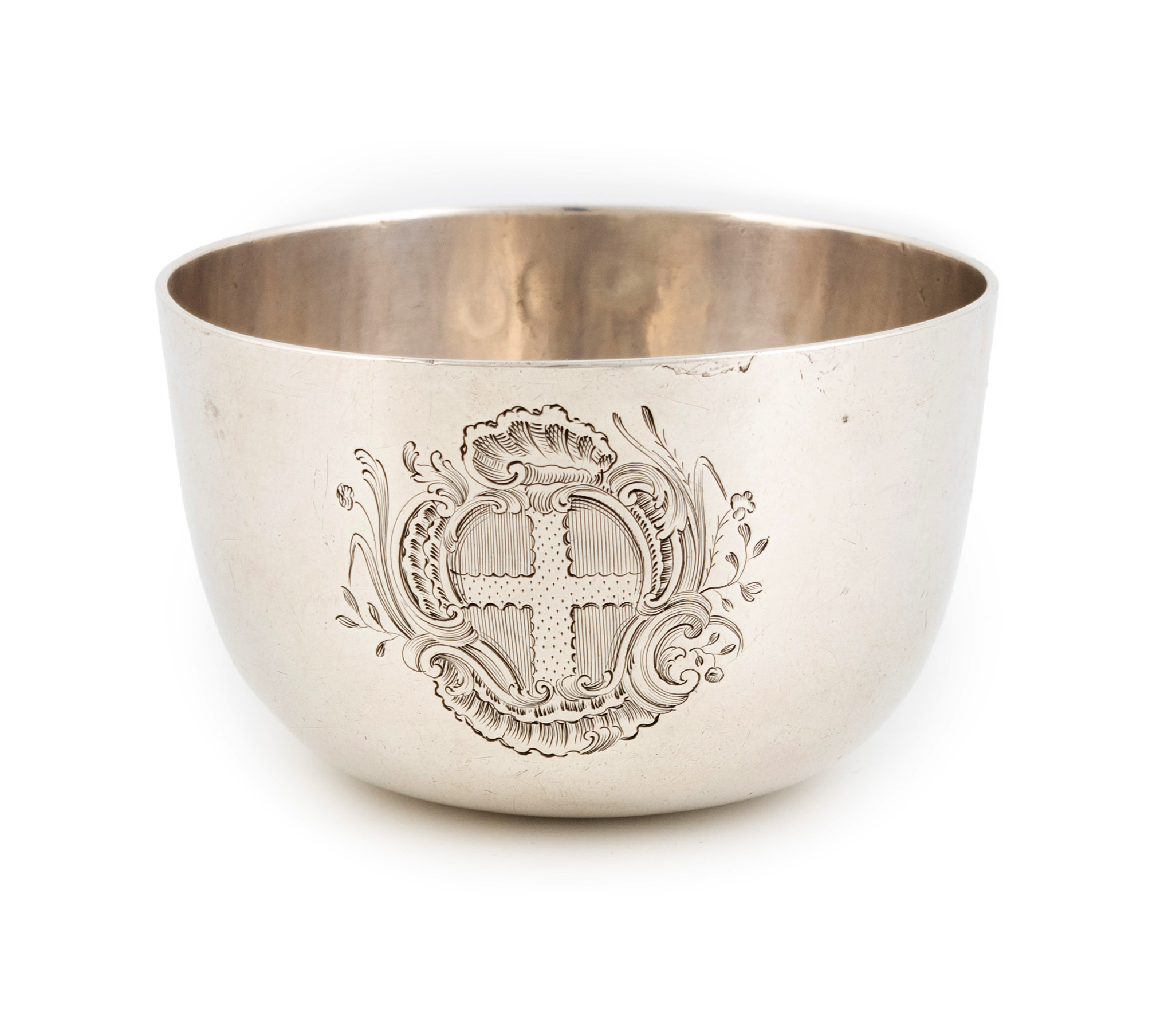 circular form, engraved with an armorial within foliate scroll mantling, the underside scratch initialled 'W.C', diameter 8.1cm, approx. weight 4.2oz.