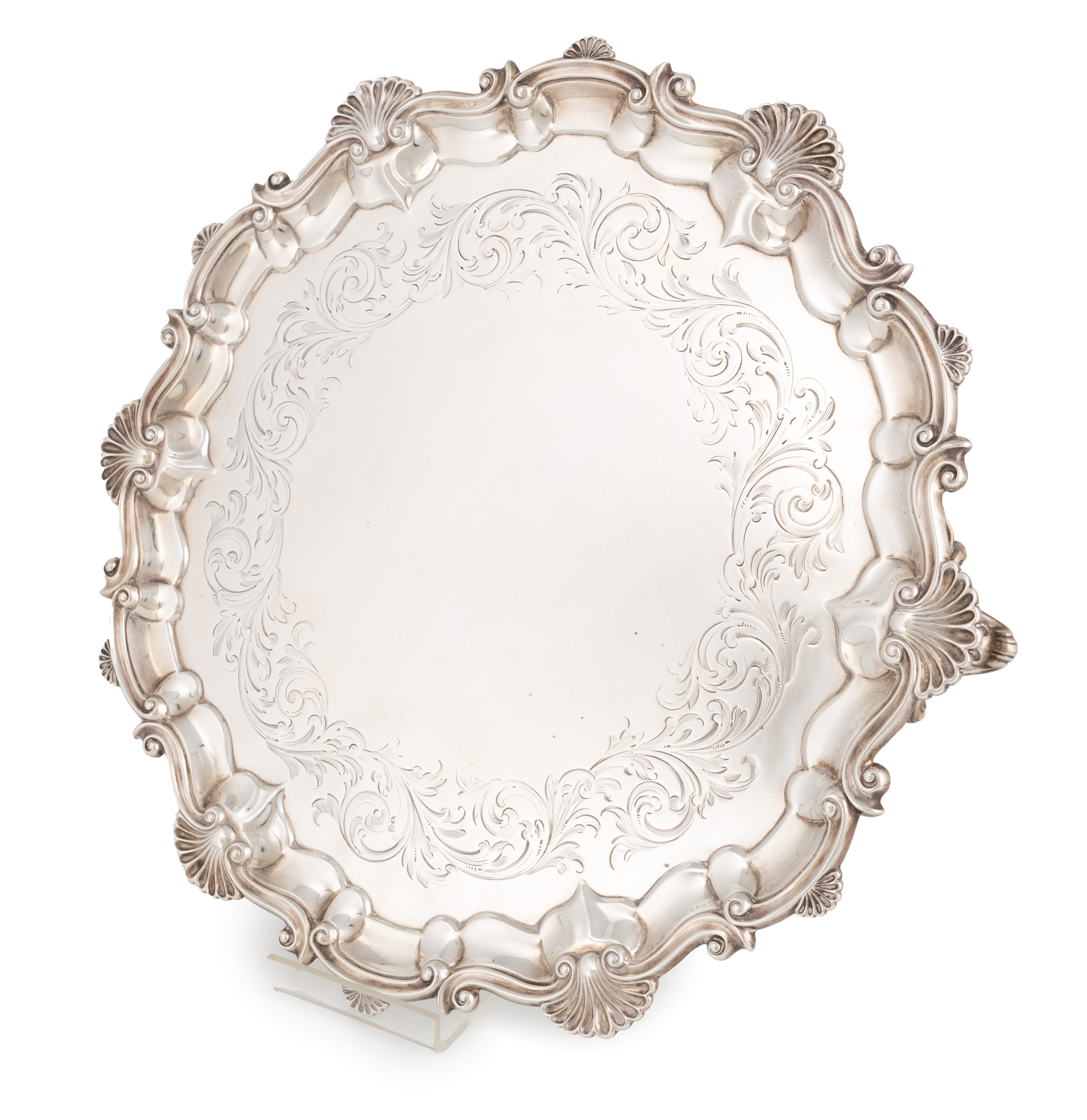 circular form with a moulded shell and scroll border, engraved scroll decoration, on three scroll bracket feet, diameter 33.5cm, approx. weight 28.7oz.