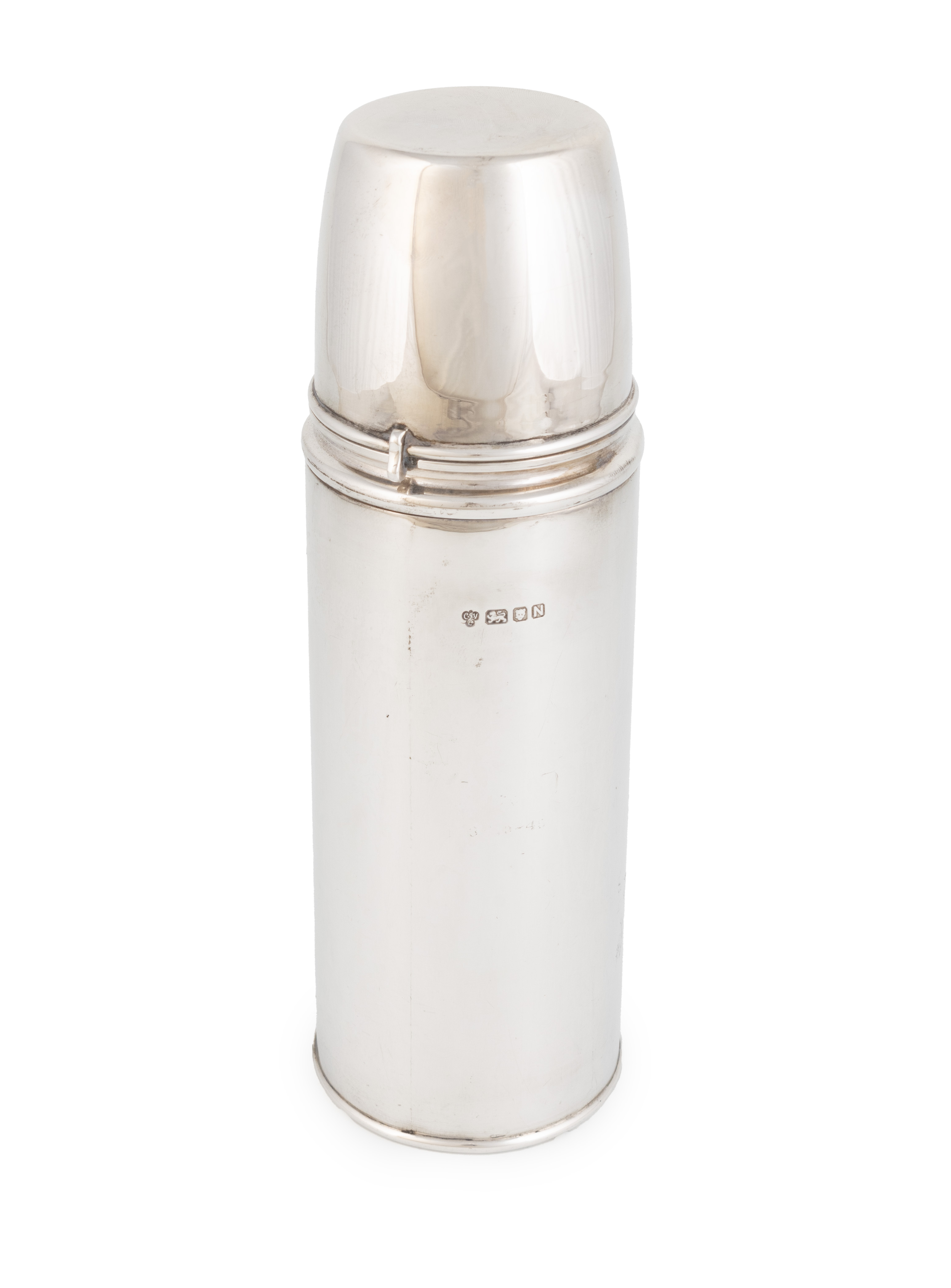 cylindrical form, bayonet fitting cover/drinking cup, with a glass thermos liner, height 25.7cm, approx. weight 14.5oz.