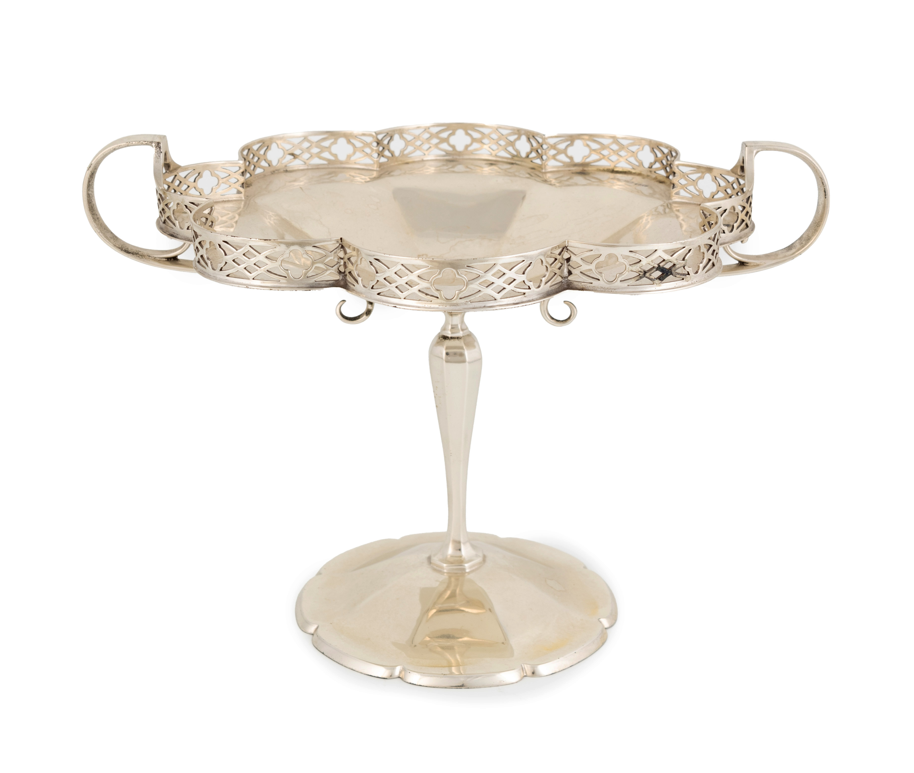 shaped circular form, pierced gallery, scroll handles, on a tapering baluster stem, on a raised circular foot, height 18cm, approx. weight 20oz.