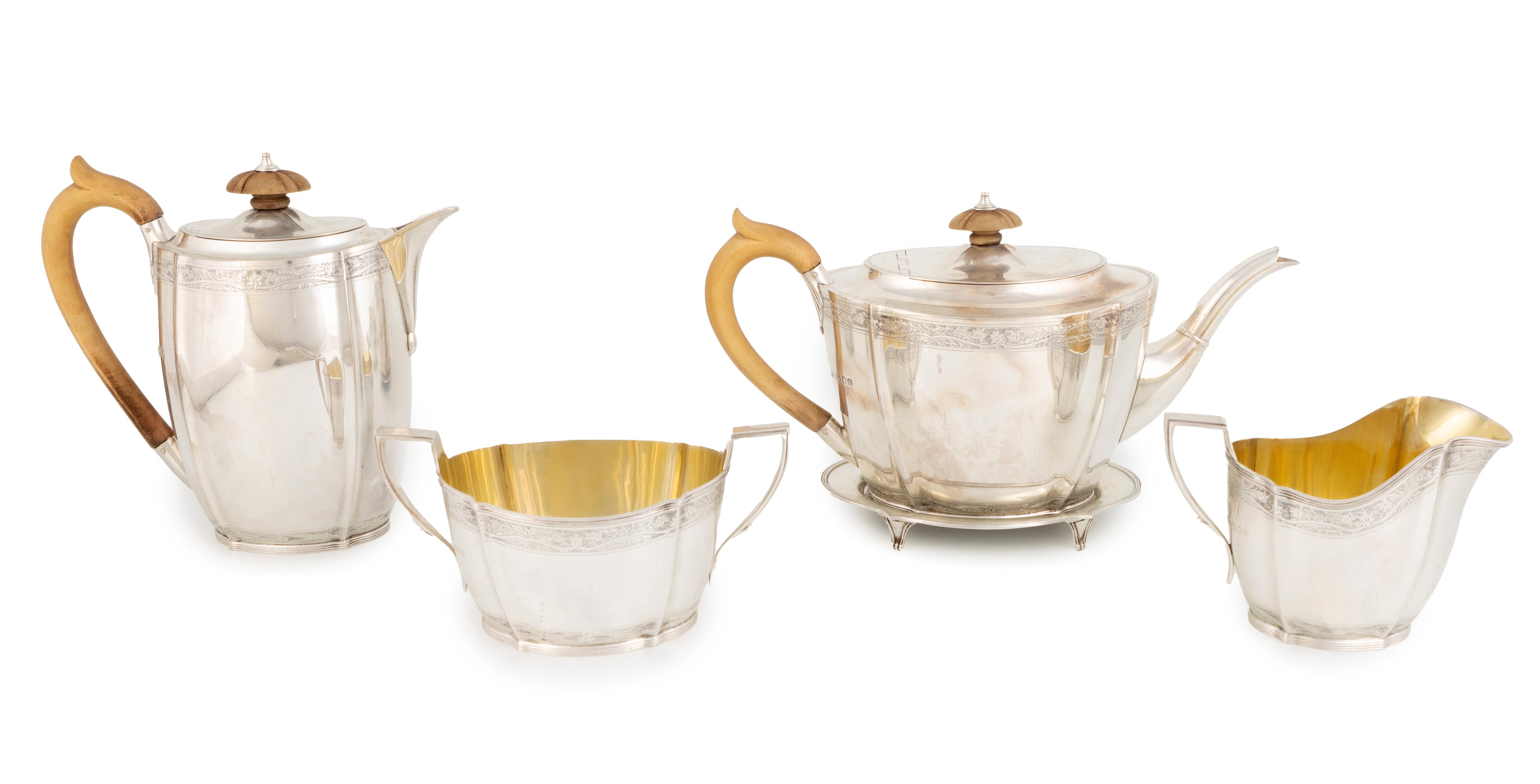 comprising: a teapot on stand, a hotwater pot, a cream jug and a sugar bowl, lobed oval form, engraved decoration, scroll handles, length of tea pot handle to spout 18cm, approx. weight 53oz. (5)