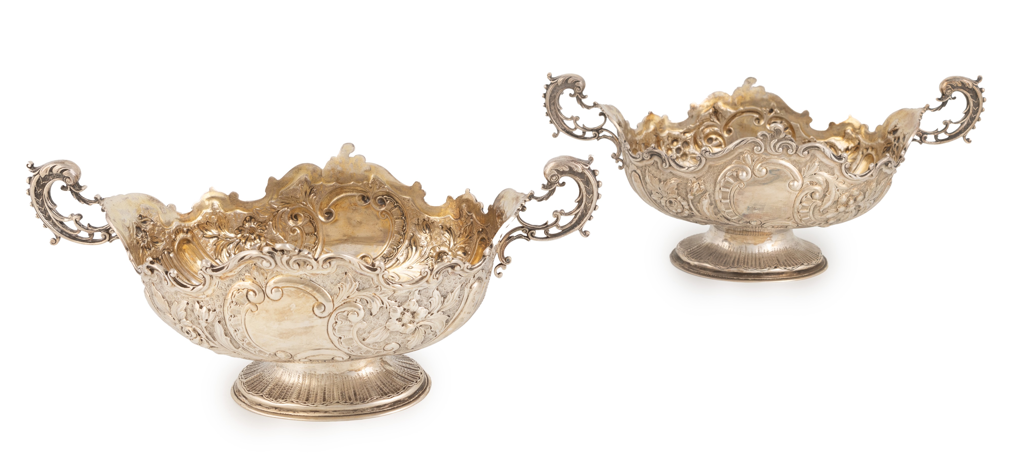 oval form, embossed foliate decoration on a matted background, stylised dolphin scroll handles, on raised oval bases, length 28cm, approx. weight 20oz. (2)