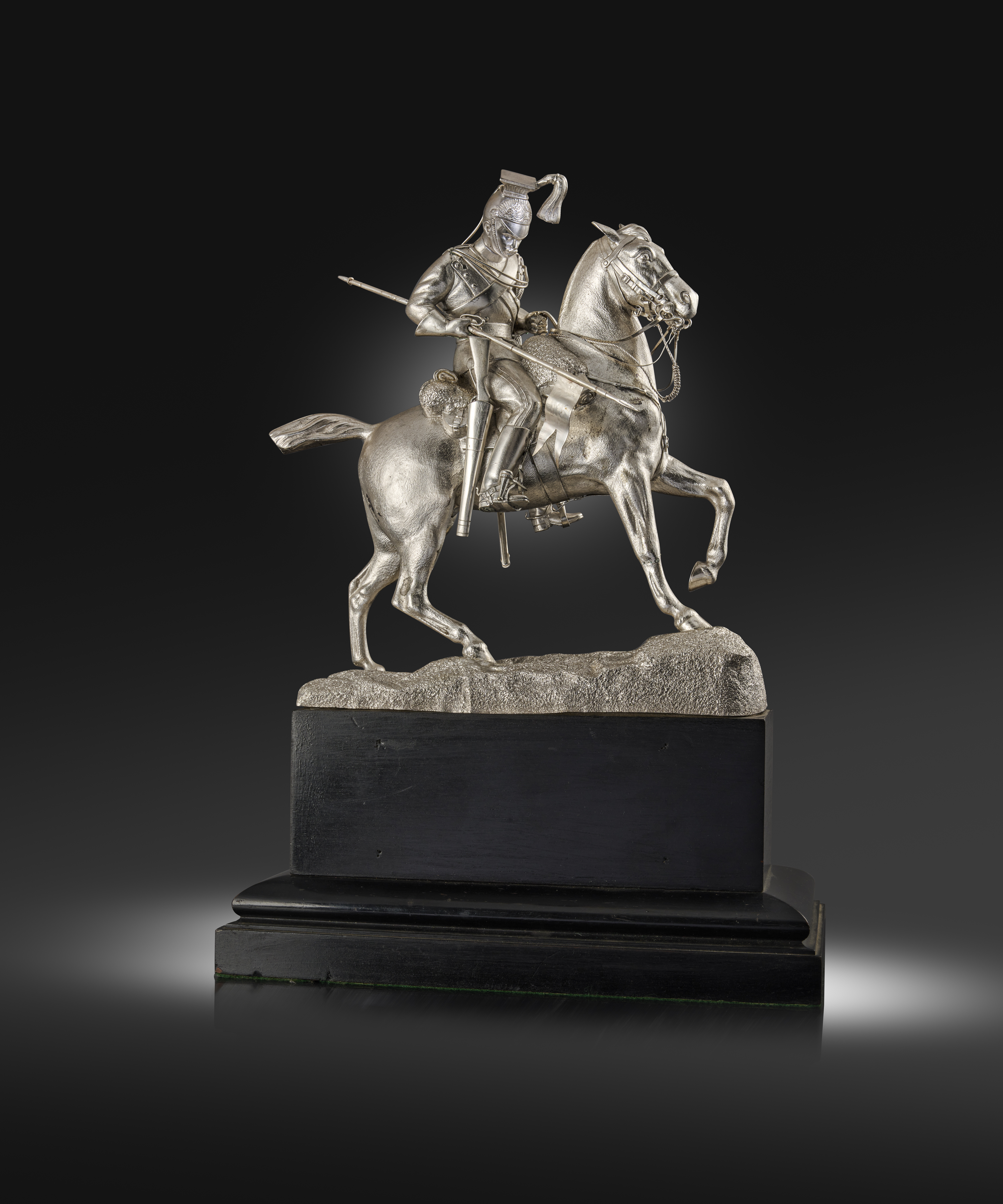 modelled as a mounted Lancer officer, probably from the 12th (Prince of Wales) or the 9th (Queen’s Own) Lancers, with textured decoration, on a black painted wooden plinth, height 35.4cm.