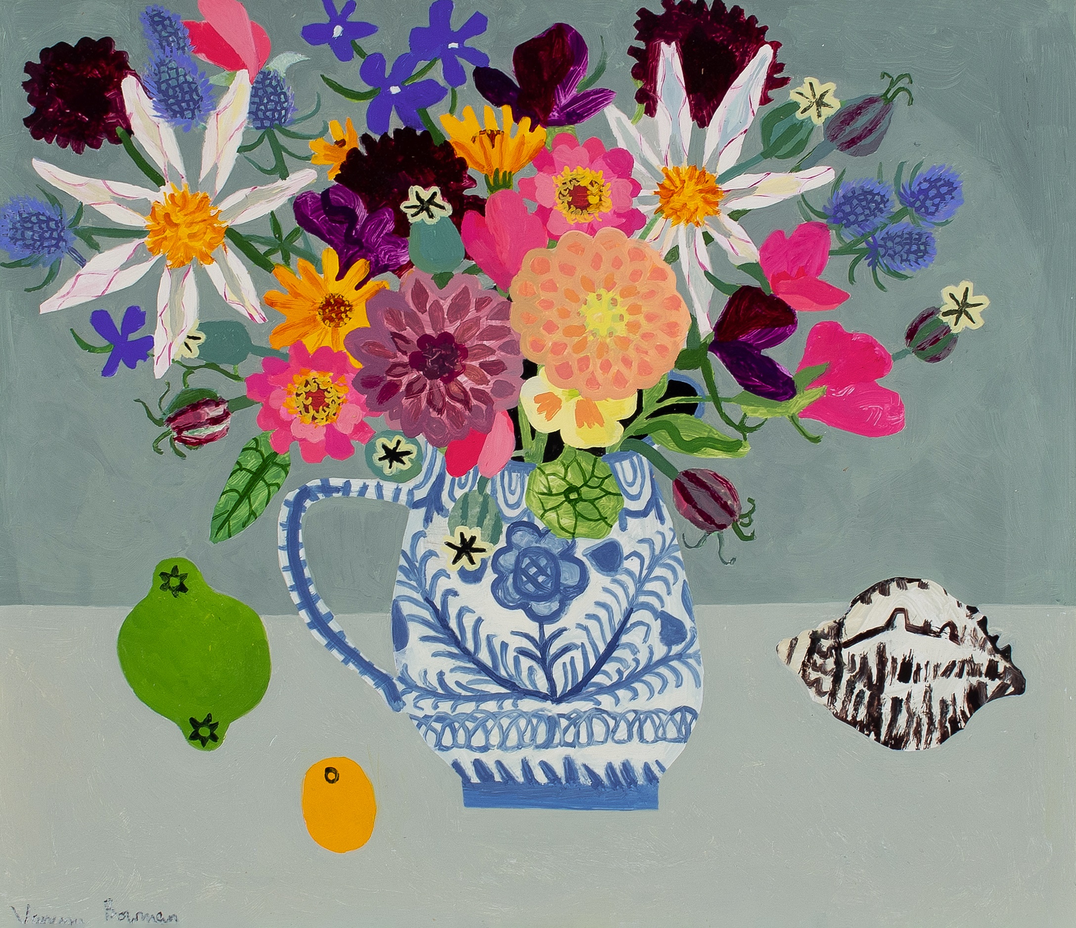 "Vanessa’s paintings observe the simple beauty of the everyday surroundings of her native Dorset. Captured in her richly detailed still lifes and her whimsical landscape paintings, she uses her innate sense of colour to jewel-like effect. She creates work that she hopes will evoke joy in the eye of the beholder.